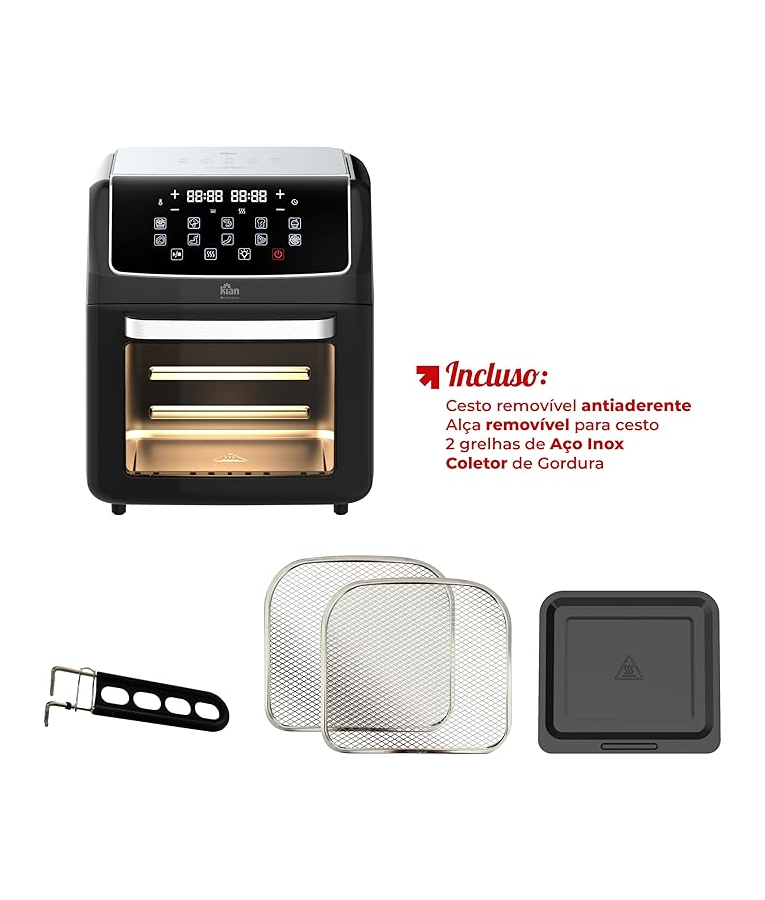 A Air Fryer Forno Kian AFO-101D de 12 litros combina tecnologia e praticidade para transformar sua experiência na cozinha. Com um design moderno e ampla capacidade , permite preparar refeições mais saudáveis sem a necessidade de óleo, mantendo todo o sabor e crocância dos alimentos.