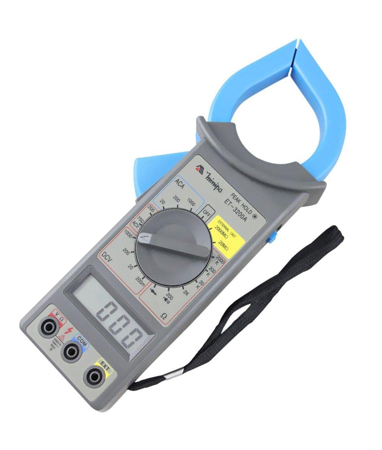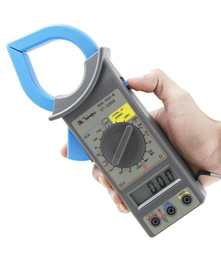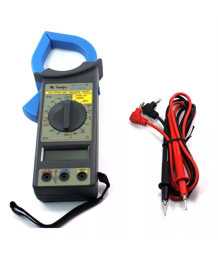 O alicate amperímetro digital Modelo ET-3200 possui mudança de faixa manual e leitura máxima de 1999 contagens.
