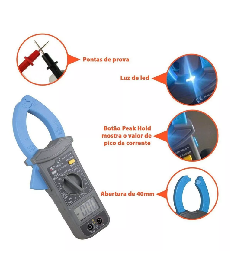 ? Destaca-se também pela sua garra com iluminação. Conta ainda com tensão DC de 1000V, AC de 750V, corrente AC de 1000A e Peak Hold