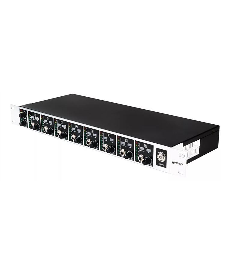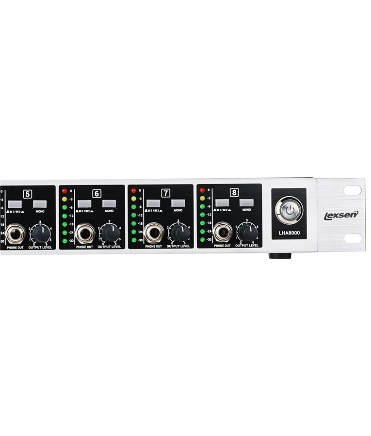 O LHA8000 da Lexsen é um amplificador de fones de ouvido com 8 canais, que possui funções superiores de desempenho, roteamento e mixagem para acomodar até mesmo os ouvidos mais exigentes. Uma entrada auxiliar estéreo em cada canal permite que cada artista equilibre o sinal de entrada direta. O LHA8000 oferece 8 amplificadores de alta potência que podem levar cargas de até 8 Ohms. Cada amplificador possui seu próprio medidor de saída com 7 LEDs, chaves mono esquerda e direita.