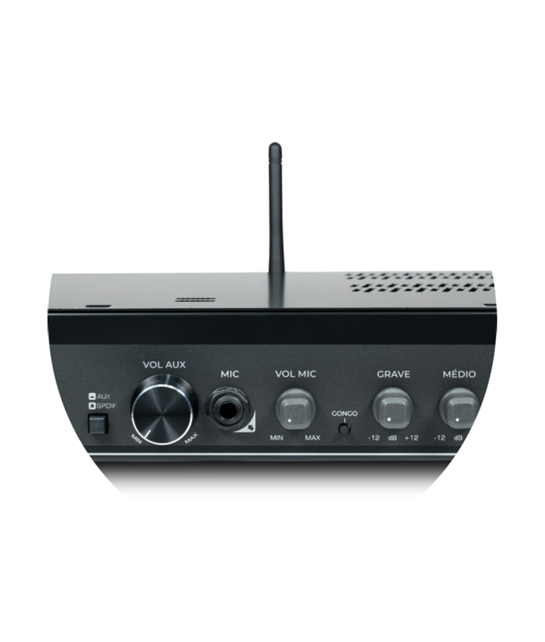 Amplificador que pode sonorizar 2 ambientes distintos, pois possui dois canais Independentes com controle de volume separados.
