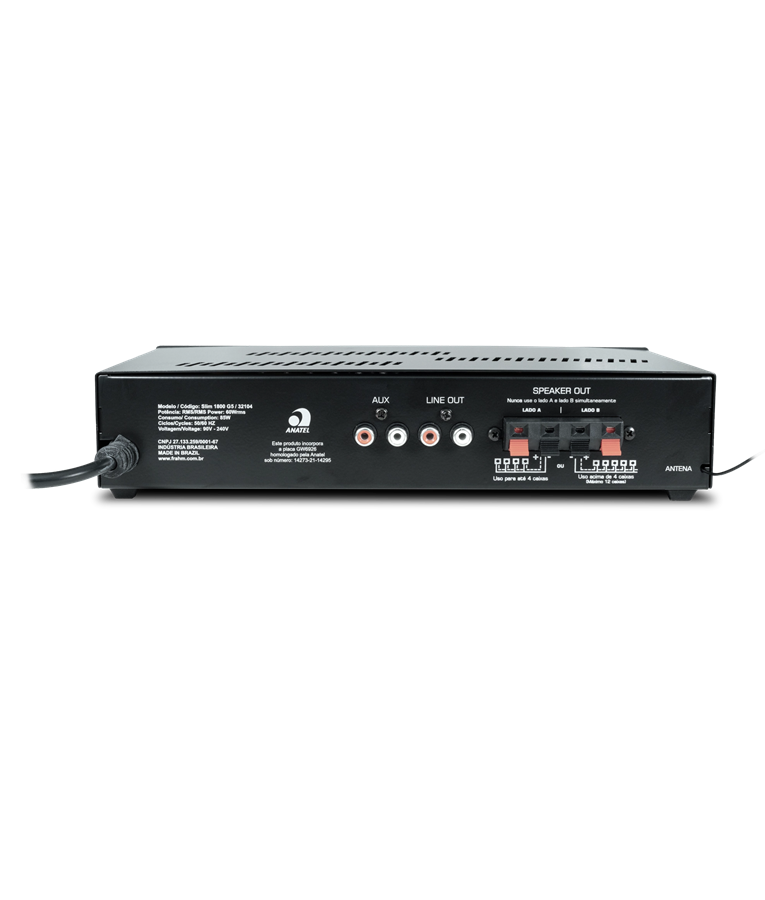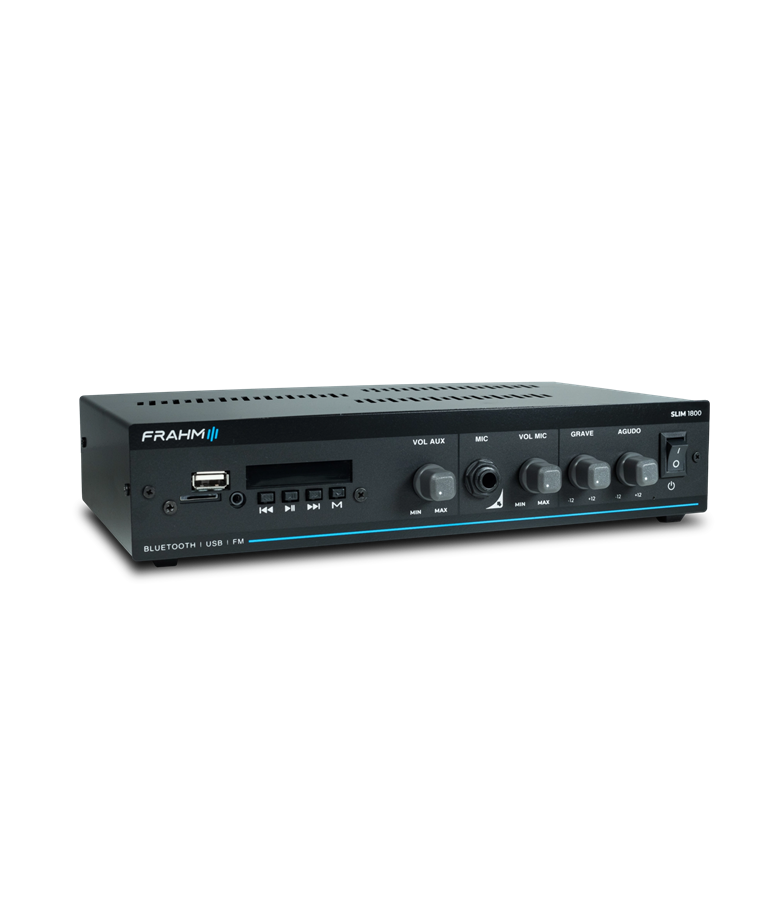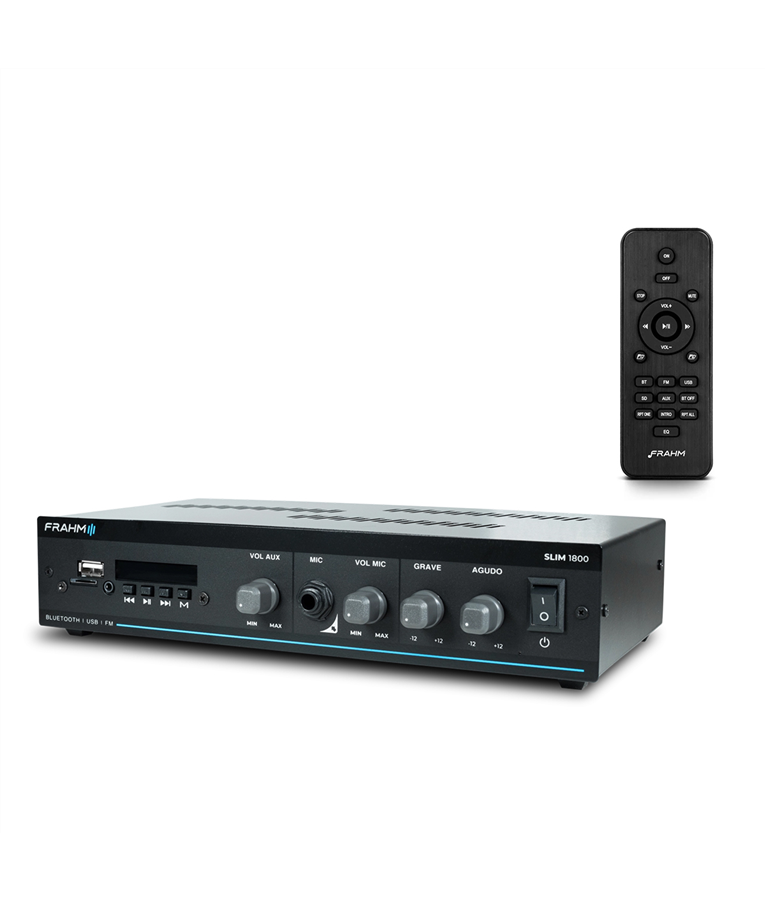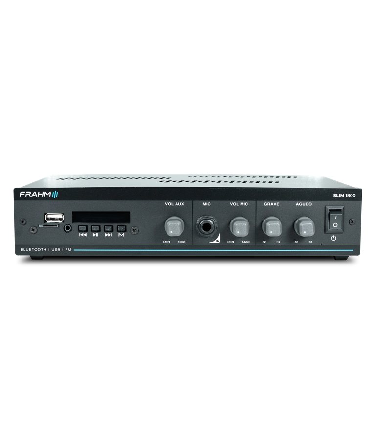 A linha nº1 em amplificador comercias do Brasil, chega em sua quinta geração (G5), trazendo ainda mais tecnologia e um visual único e inovador. Essa geração reflete toda a confiabilidade, sem perder sua essência. O amplificador Slim 1800 G5 com 60 Watts RMS de potência, aceita qualquer número de caixas de sobrepor ou caixas de embutir inferiores a 12 (usa-se de 1 a 12 sem problemas com limite mínimo de impedância). Recomenda-se utilizar com no máximo 35 metros de fio (distância entre a última caixa de embutir ou sobrepor em relação à posição onde ficará o amplificador). Indicação de uso: Recepções, clínicas, conveniências, farmácias, lojas e muitos outros. Benefícios: Visual único e moderno; Ligação de caixas em paralelo; Facilidade em sua operação; Entrada para conexão de microfone; Equalizador; Conexão auxiliar via RCA/P2, USB, Bluetooth, MicroSD. Diferencial 1: Visual único e moderno: seu visual, reflete todas a inovação da linha líder em amplificadores. Diferencial 2: Fonte chaveada: com proteção a instabilidade da rede, mantendo a potência, mesmo com oscilações da rede elétrica, de menor tamanho e peso, ?comparado com fontes convencionais? fazendo com que o equipamento fique leve e sem a necessidade de usar transformadores pesados. Diferencial 3: Confiabilidade eletrônica: em sua quinta versão eletrônica, traz ajustes e estabilidade a sistemas de som. Diferencial 4: Suporte técnico especializado: suportes para projetos e para esclarecimento de dúvidas em sua operação e para projetos. Diferencial 5: Confiabilidade: a linha número 1º em amplificadores. Potência : 60W RMS Amplificador mono : Classe AB Número de vias : 2 Frequência de atuação : Graves: 90Hz - Agudos: 10KHz Sensibilidade do MIC : 18mV Sensibilidade do AUX : 350mV Bivolt automático : 90-240V Dimensões (AxLxP mm) : 69,7x270x165 Peso : 1500g