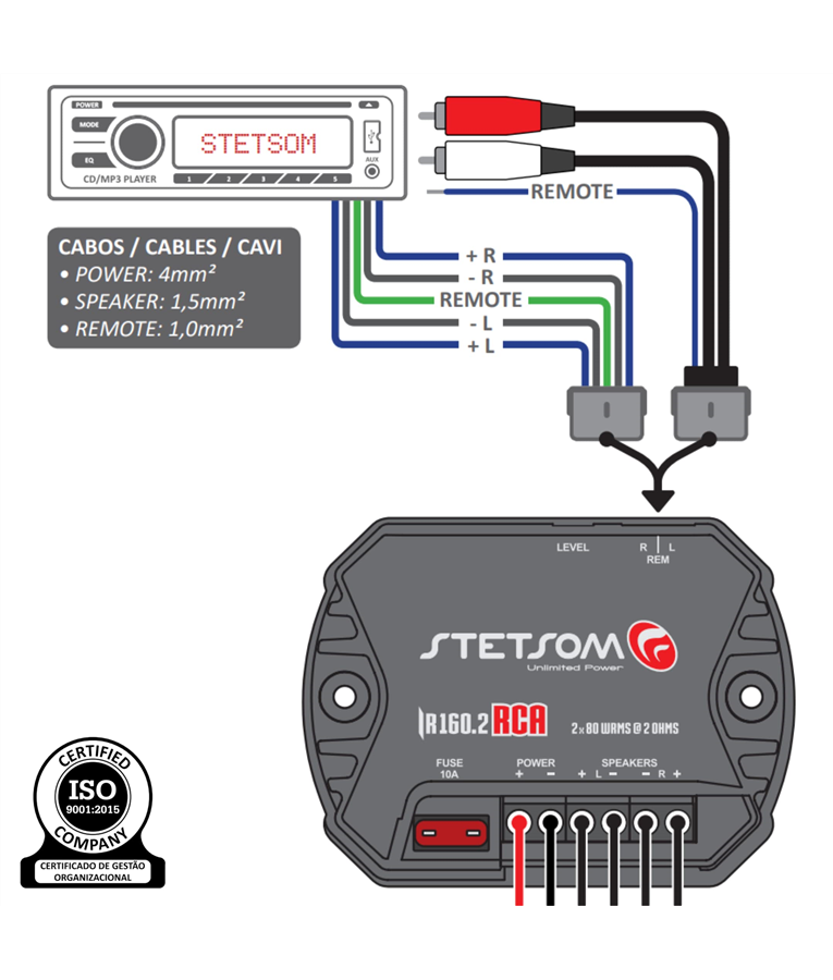 Potência RMS em 2 Ohms: 13,8V 2 x 80W RMS