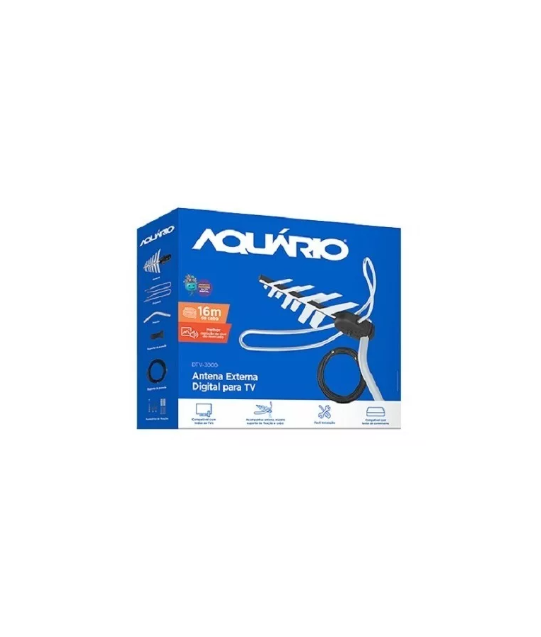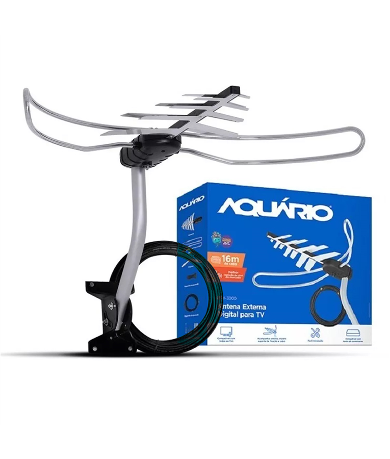 DTV- 3000 Aquário é uma Antena Externa completa 4 em 1 que capta todos os canais VHF, UHF, FM e HDTV, seja digital ou analógico proporcionando assim, muito mais opções de entretenimento e qualidade de imagem em sua TV. Para que sua instalação seja realizada de forma prática e rápida, a antena acompanha: cabo de descida com 16 metros, suporte e mastro. Tudo o que você precisa em um único produto!