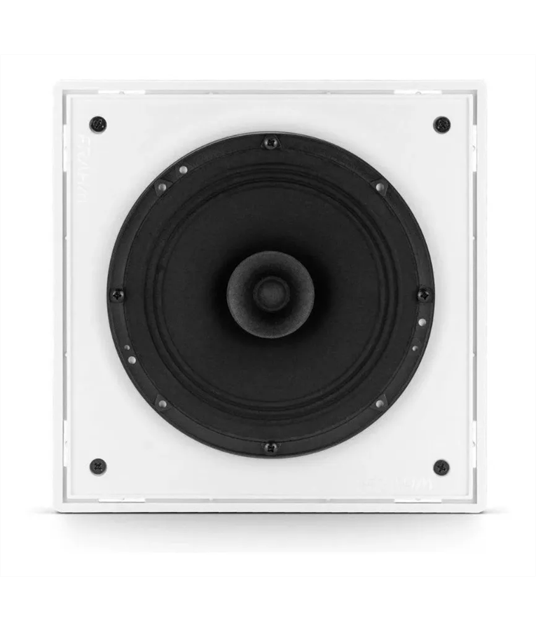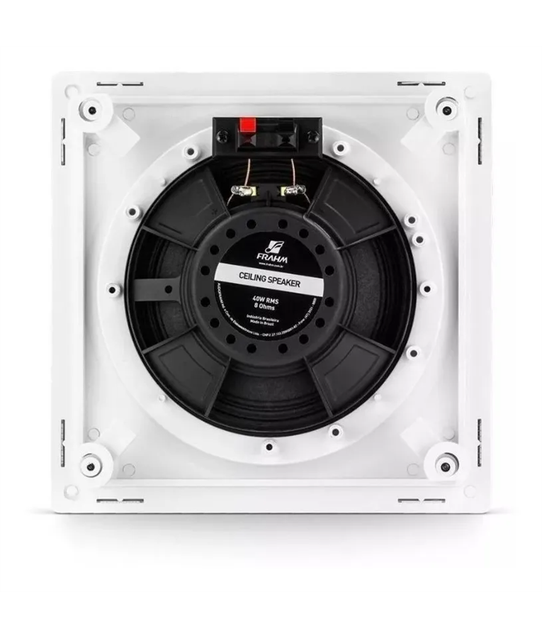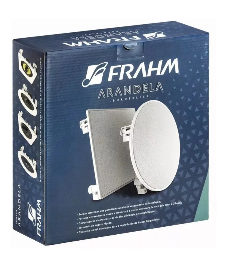 Uma linha completa projetada para atender a necessidade de sonorização dos mais variados ambientes. Na residência ou em ambientes comerciais, as novas arandelas Frahm permitem a perfeita integração entre o produto e o ambiente em que são instaladas. As bordas ultra finas garantem a presença discreta do produto e componentes de alta fidelidade produzem um som envolvente. Características: Disponível no formato redondo e quadrado; As molduras foram projetadas com sistema de ampliação do ângulo de dispersão; Possuem pontos exclusivos para a fixação dos mais variados tipos de trafos, não permitindo que sejam colocados em pontos que causam danos a estrutura; No modelo quadrado cada uma das torres é responsável pelo travamento de uma das laterais da arandela o que proporciona fixação de 100% de sua base no teto; O projeto permite flexibilidade na furação do local de instalação (se a a furação não ficar perfeita conforme o gabarito, ainda assim a arandela irá se encaixar sem que o trabalho precise ser refeito). Permite o travamento desde a menor até a maior estrutura de teto (de 1mm a 30mm); Terminais de engate rápido; Conjunto móvel otimizado para a reprodução de baixas frequências; Tipo : Full Range Impedância : 8 Ohms Potência Máxima : 80 W Potência RMS : 40 W Woofer 6"""" : Cone e borda de celulose, bobina móvel em alumínio Resposta de frequência : 100 - 18KHz SPL (dB/W/m) : 93 Dimensão em mm (AxLxC) : 222 x 222 mm Dimensões do furo para instalação : 196 x 196 mm Altura da arandela : 65 mm Peso Líquido : 0,75 Peso Bruto : 0,93
