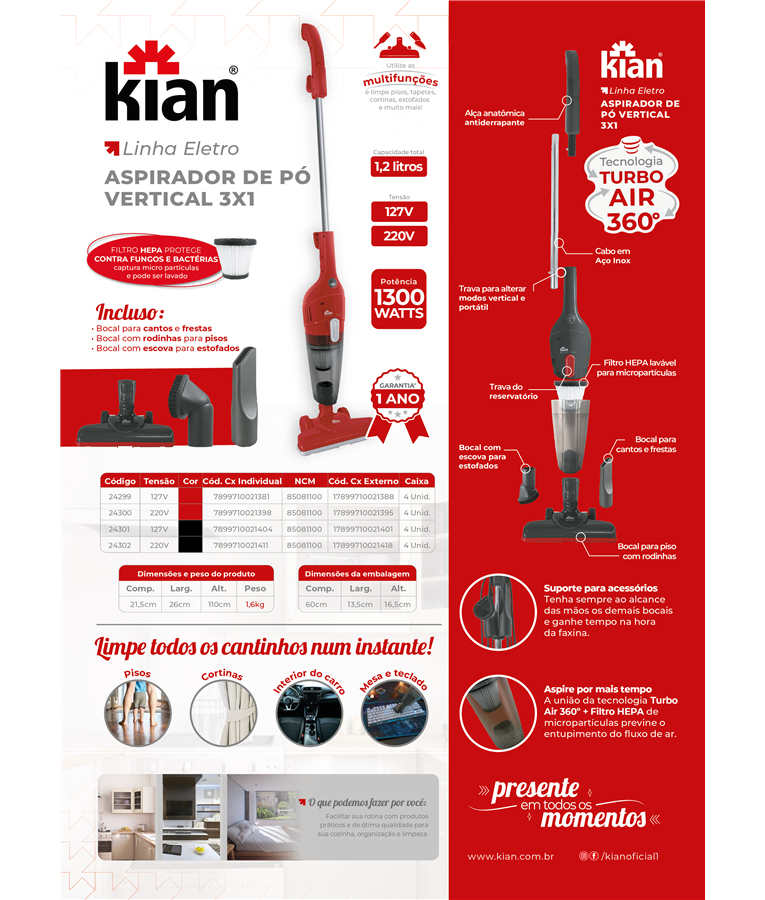 Produzido pela Kian, uma marca reconhecida por sua inovação e qualidade no mercado, o Aspirador de Pó Vertical 3x1 AP-100 é fabricado com materiais duráveis para oferecer longa vida útil. Ele conta com garantia de 1 ano, assegurando tranquilidade e confiabilidade para o consumidor.
