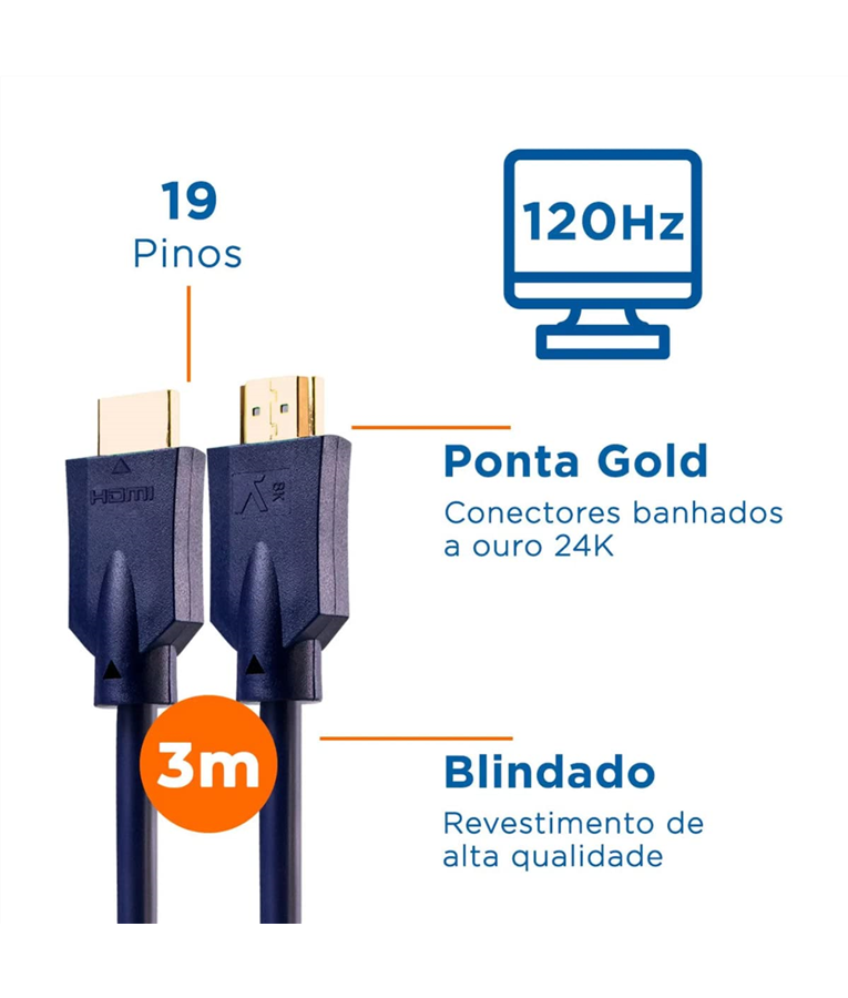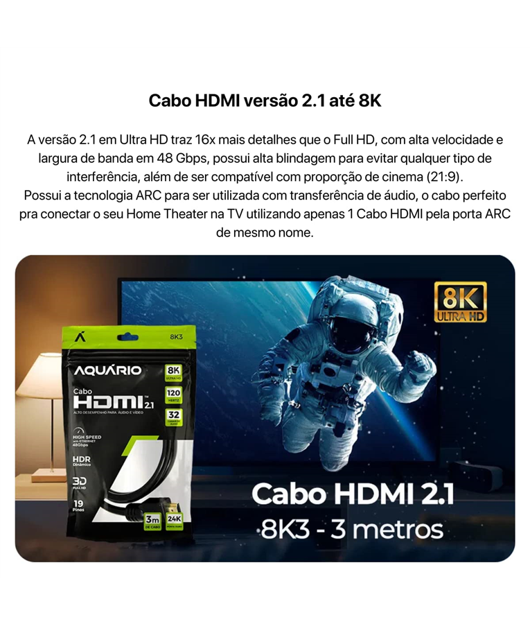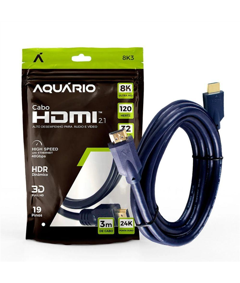 - Cabo HDMI Aquario 2.1 8k 3d 19 Pinos 3 Metros - 8k3
