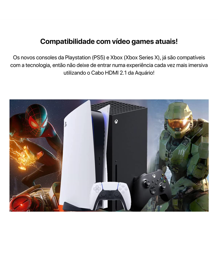 os novos consoles da playstation (ps5) e xbox (xbox series x), já são compatíveis com a tecnologia, então não deixe de entrar numa experiência cada vez mais imersiva utilizando o cabo hdmi 2.1 da aquário!
