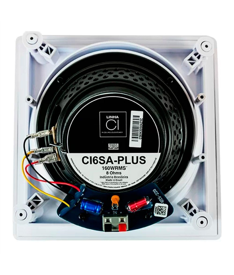 JBL ARANDELA - CI6SA PLUS 160W RMS - TELA MAGNÉTICA Arandela Quadrada Angulada linha CI PLUS CAIXA DE SOM JBL CI6SA PLUS ARANDELA ANGULADA 160W RMS ? A nova linha Ci Plus, foi desenhada para atender o mercado especializado de home theater e o mercado de instalação de som ambiente, com formatos quadrados e retangulares, gabinetes angulados ou regulares, borda ultra fina e telas magnéticas de alumínio à prova de oxidações, para atender a demanda dos arquitetos. DIFERENCIAIS ? Excelente performance sonora na categoria. ? Instalação super fácil. ? Design moderno e clean para atender aos mais diversos tipos de ambientes e decorações. ? Formatos quadrados e angulados para atender a demanda dos arquitetos. O QUE MUDA NA NOVA LINHA? ? Novo crossover - melhor resposta de frequencias, trazendo graves mais encorpados, médios mais nítidos e agudos com maior extensão. ? Maior potência admitida em todos os novos modelos, proporcionando a utilização de amplificadores ou receivers mais potentes. ? Telas com fixação magnética para facilitar a instalação. Basta aproximar da caixa que a tela já se encaixa. ESPACIFICAÇÕES TÉCNICAS ? Potência: 160W RMS ? Resposta de Frequência: 53Hz - 20kHZ ? Sensibilidade: 90 dB ? Impedância: 8 Ohms Alto Falantes: ? Woofer: Cone de Kevlar 6,5"""" ? Mid-Range: n/a ? Tweeter: Domo de seda de 20mm ? Tipo da tela: Magnética sem borda ? Formato: Quadrada Angulada Dimensões do produto: ? Dimensões de corte (A x L x C): 12,4 x 21 x 21 cm ? Dimensões da tela: (A x L): 24,2 x 24,2 cm ? Profundidade: 12,4 cm ? Peso: 1,8 Kg ITENS INCLUSOS ? 01 Arandela CI6SA Plus 160W RMS ? 01 manual do proprietário