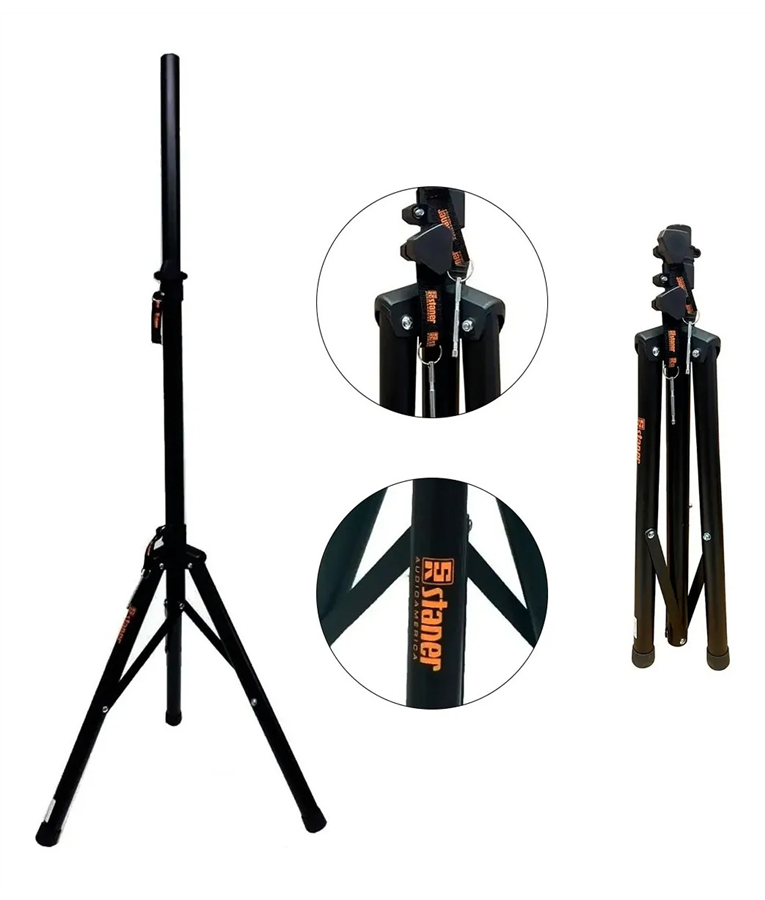 Tripés reforçados, construídos com tubos de 1 ½?, extremamente resistente e leve. Comporta caixas de até 50kg, com estágios de altura c/ trava que vai de 0,92m a 1,61m. Eles ocupam pouco espaço e podem ser levados até no porta malas do caro.