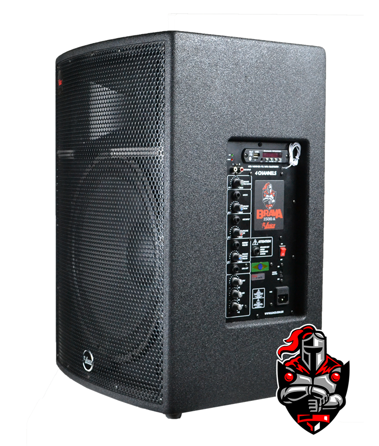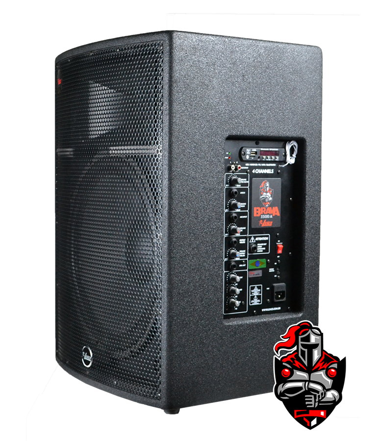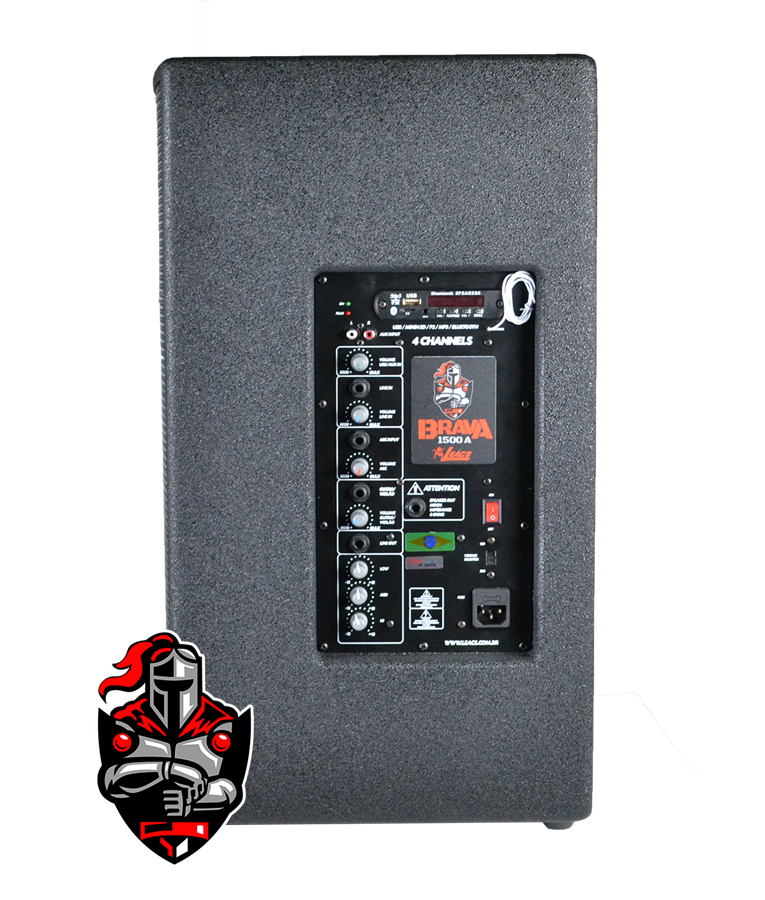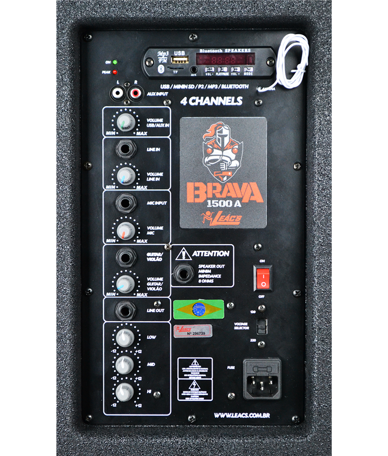 Chegou a nova linha BRAVA de caixas Ativas e Passivas da Leác?s!!! A unica caixa ATIVA do BRASIL com 4 canais de entrada! A solução completa para músico, DJ, cantor ou para os mais exigentes ouvidos um som de qualidade! Caixa de som pronta para festas, eventos e shows. Uma caixa de som amplificada, com 4 canais de entrada (aux. RCA, line IN P10, microfone P10, guitarra/violão P10) além das conexões bluetooht, entrada P2, leitor de cartão e USB. BRAVA 1500 ATIVA - 250w RMS ESPECIFICAÇÕES TÉCNICAS POTENCIA RMS EM 4 ohms: 250w RMS POTENCIA MUSICAL 4 ohms: 500 RMS RESPOSTA DE FREQUÊNCIA: @-3Db 58Hz A 20KHz SENSIBILIDADE DE ENTRADA LINE: 0 Db SENSIBILIDADE DE ENTRADA MIC: 22Db SENSIBILIDADE DE ENTRADA RCA: 4Db SENSIBILIDADE DE ENTRADA VIOLÃO/ GUITAR: -4Db IMPEDÂNCIA DAS ENTRADAS LINE E MIC: 22k ohms DISTORÇÃO HARMÔNICA: INFERIOR A 0,1% NA POTENCIA NOMINAL ANGULO DE COBERTURA: 90° HORIZONTAL / 50° VERTICAL MÁXIMO SPL: 120 db SPL RECURSOS DA LINHA BRAVA 1500 ATIVA -ENTRADA DE LINHA desbalanceada -ENTRADA DE MICROFONE desbalanceada -ENTRADA AUXILIAR RCA -ENTRADA PARA INSTRUMENTO -MÓDULO USB COM ENTRADA AUXILIAR P2 STEREO -LEITOR DE CARTÃO SD/MMC -FM COM SINTONIA AUTOMÁTICA -CONTROLE REMOTO -3 VIAS DE EQUALIZAÇÃO -SAÍDA DE LINHA DESBALANCEADA (LINE OUT) -TRANSFORMADOR EI -SAÍDA PARA UMA BRAVA 1500 PASSIVA (IMPEDÂNCIA MÍNIMA 8 Ohms) -CONTROLE DE VOLUMES INDEPENDENTES PARA MIC / LINE-RCA / INSTRUMENTOS / USB -SELETOR DE VOLTAGEM 120/240vac