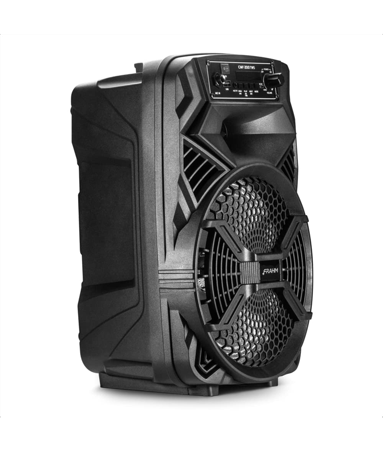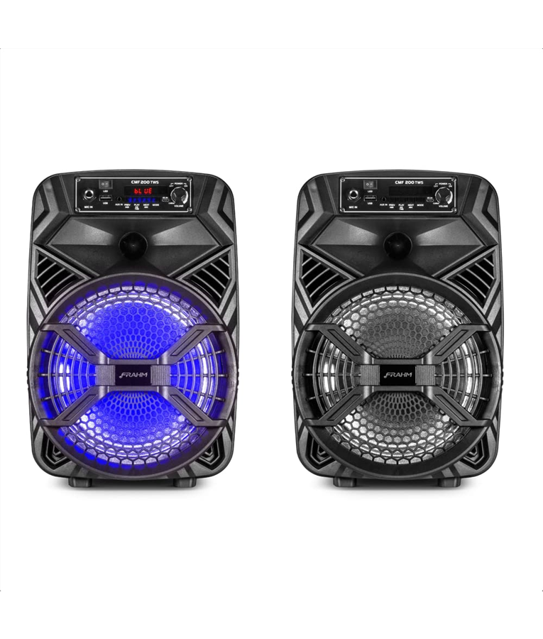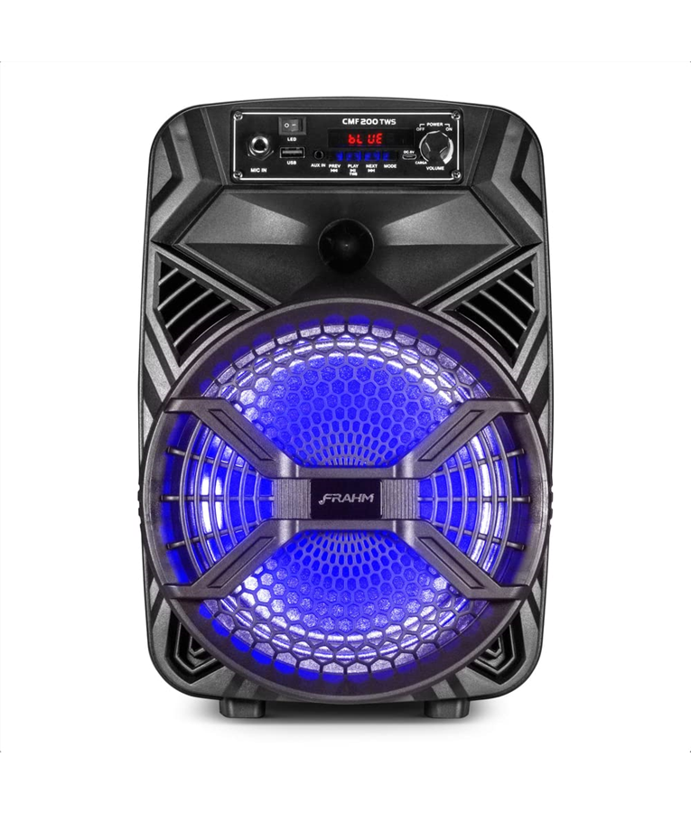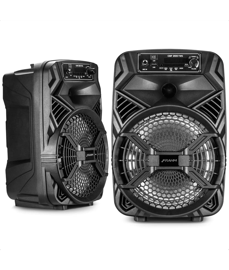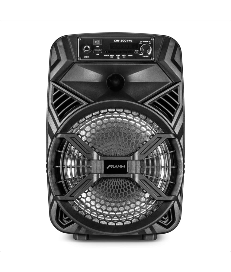 A caixa CM 200 TWS possui potência de 200W, e foi projetada para fazer parte de seus momentos especiais, onde se faz necessário praticidade e conectividade. As conexões de mídias trazem as principais tecnologias para transmissão de áudio: Bluetooth, USB, FM, além de possuir entrada P2 que se conecta com qualquer equipamento com saída de sinal de áudio, como notebooks, tablets, entre outros. Também possui entrada P10 para microfone ou instrumento musical, como violão, guitarra, teclado entre outros. Disponível com a função TWS (Frahm Wireless connect) que permite que duas caixas do mesmo modelo se conectem através da tecnologia Bluetooth, aumentando sua experiência sonora. Com bateria interna com autonomia de 6h em volume médio e 8h em volume mínimo, dão portabilidade para sua playlist, seja em festas, parques, camping, praia ou em qualquer lugar sem necessidade de estar conectada em rede elétrica. Os leds que iluminam o falante de 8? são o efeito que qualquer festa precisa, também conta com 1 driver que proporcionam alta eficiência em altas frequências Fonte chaveada Externa bivolt para conexão à rede elétricas de 110v e 220v. Tecla liga-desliga iluminação frontal de LEDs. Descubra todas as vantagens de ter uma caixa Frahm junto com você, em seus melhores momentos. ESPECIFICAÇÕES TÉCNICAS Potência : 200W RMS Canais de entrada : Bluetooth / USB / FM / Auxiliar / Microfone Sistema Acústico : Bass Reflex Alto-Falante : 8"""" e Driver 1"""" Bateria Interna : Lítio 3,6V - 1200mAh Dimensões : 34 x 23 x 19,5 cm Peso : 1,5 Kg
