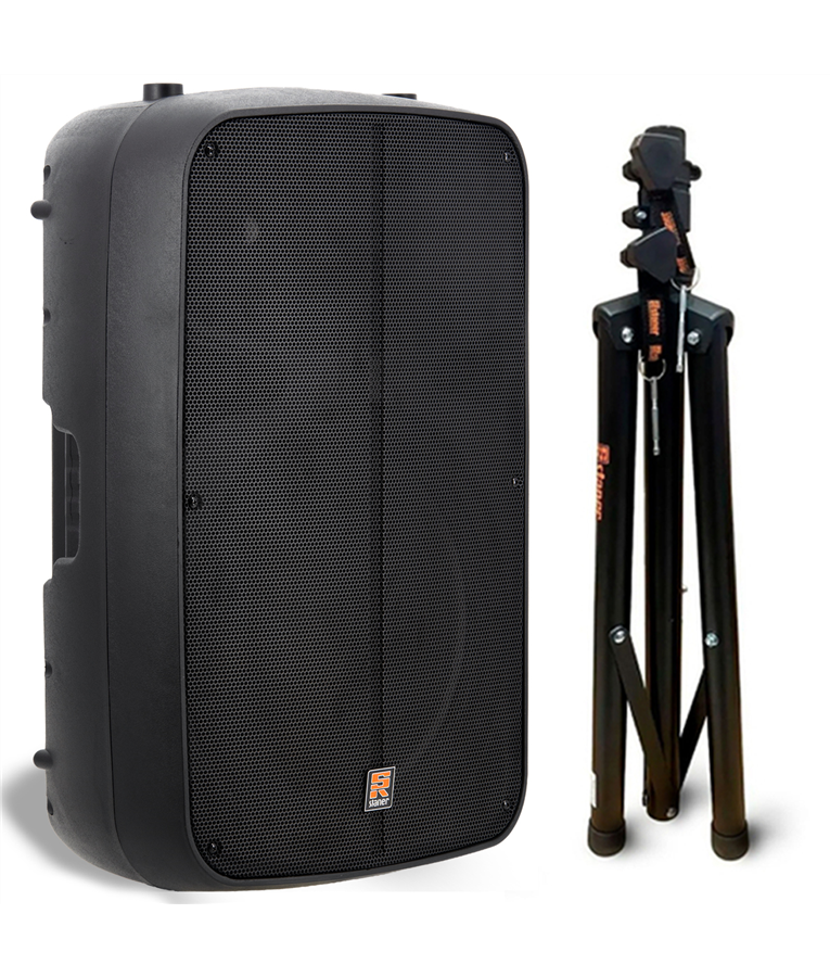 Caixas acústica com timbre excepcional e resposta cristalina. Possui bi-amplificação, leitores de MP3 através de portas USB / SD além de comunicação via B.T. Tamanho compacto aliado ao design elegante, torna este produto único em sua categoria. Com visor LCD dinâmico com controles dos arquivos e pastas. Alto-falante de 15"""""""" Driver de Titânio 1 1/4"""""""" Bi-Amplificada 300 W RMS Comunicação via B.T. Reprodutor de MP3 via USB e SD Card Controle Remoto Frontal 05 Presets de Equalização. Receptor FM Entradas balanceadas XLR e TRS 1/4"""""""" Entradas P2 e RCA Auto Voltage (100~240Vac) Gabinete Exclusivo STANER Angulação para uso como monitor (L/R) 03 pontos para montagem """"""""Fly"""""""" Encaixe para pedestal com trava Peso: 19kg Suporte P/caixa de Som Tripé Staner Um dos melhores suportes do mercado. Pequeno, leve e super resistente. Suporte original Staner. Medidas da Embalagem Fechada: 12 x 12 x 71; 2,10 kg Altura Mínima: 0,90cm Altura Máxima: 1,50m Tripés reforçados, construídos com tubos de 1 ½?, extremamente resistente e leve. Comporta caixas de até 50kg, com estágios de altura c/ trava que vai de 0,92m a 1,61m. Eles ocupam pouco espaço e podem ser levados até no porta malas do caro. - Marca: Staner - Modelo: Extensível - Construído com tubos de 1 ½?, extremamente resistente e leve - 3 Furos disponíveis para inserção do pino de segurança - Geometria das pernas permite ângulo de 120° - Abertura e fechamento das pernas e hastes através de luvas deslizantes - Capacidade: 50 kgs - Regulagem de abertura dos pés - Trava de segurança - Cor: Preto