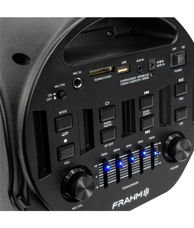 Função TWS (Frahm Wireless Connect) que permite que duas caixas do mesmo modelo se conectem através da tecnologia Bluetooth, aumentando sua experiência sonora.