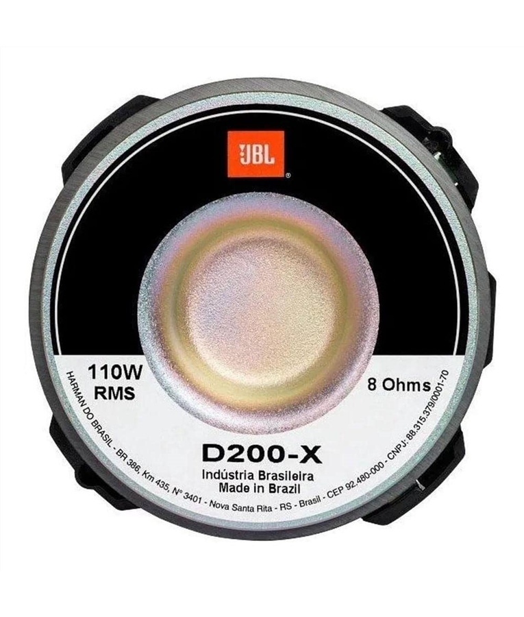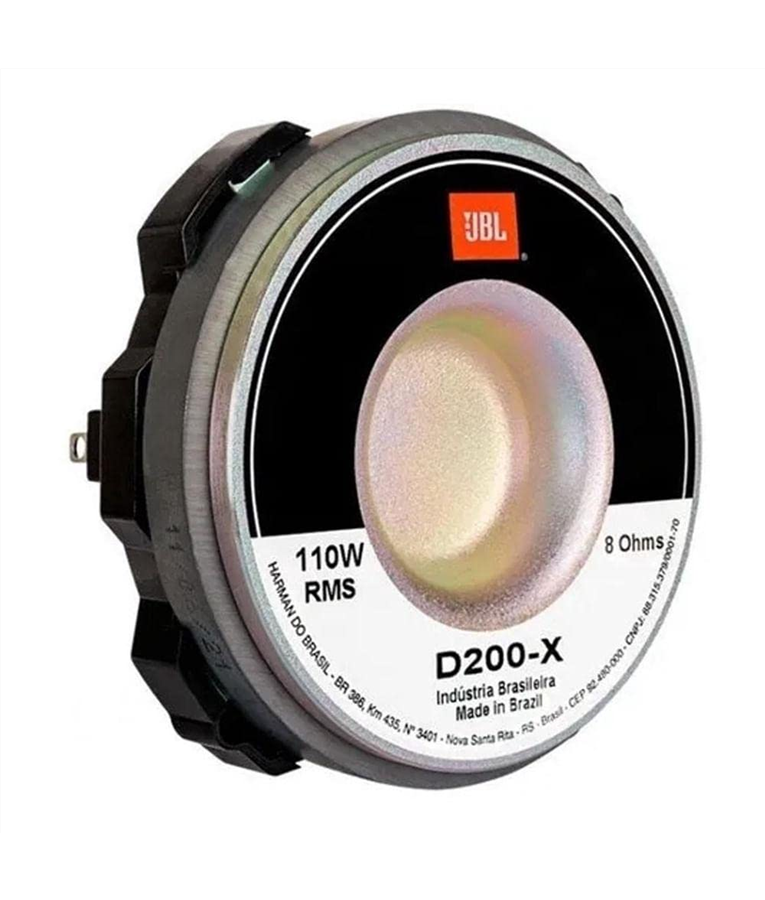 O Driver Jbl D200x 110 Rms D 200 é um Driver de compressão com diafragma fenólico de alta eficiência. Excelente para reprodução de médias e altas frequências, possui diafragma fenólico tipo domo que garante eficiência e durabilidade. Possui docade 25mm (1"""") permitindo acoplagem com diversas cornetas e base injetada resistente a altas temperaturas. Especificações Técnicas: Impedância Nominal: 8 Ohms. Potência RMS: 110W Sensibilidade: 107 dB SPL 1W!1m:3 Resposta de frequência @ -10 dB: 500 - 7500 Hz. Corneta utilizada nos testes: HL 14-25. Frequência de corte mínima recomendada: 500 Hz. Diâmetro da garganta: 25mm. Material do diafragma: Fenólico. Material do imã: Ferrite de Bário. Peso do imã: 290g. Peso: 840g. Dimensão: 107X107X68 cm. RECOMENDAÇÕES ANTES DA COMPRA Verifique a compatibilidade do produto com seus equipamentos para que não existam problemas na hora do uso! Verifique isso com seu instalador ou profissional contratado antes da compra. Verifique a voltagem, potência, impedância e outros detalhes que poderão inviabilizar a instalação ou provocar danos ao produto ou ao veículo ou equipamentos não cobertos pela garantia. Para produtos que necessitam instalação, a mesma deve ser feita por um profissional capacitado, não nos responsabilizamos por uso indevido ou instalação incorreta feita pelo próprio usuário ou outro não habilitado.