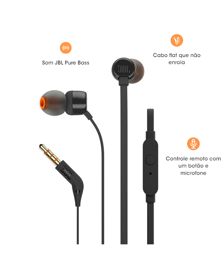 Apresentamos os fones de ouvido intra-auriculares JBL TUNE110. Eles são leves, confortáveis e compactos. Sob a estrutura durável do fone, um par de drivers de 9 mm produz graves potentes, reproduzindo o som JBL Pure Bass que você experimentou em salas de concerto, arenas e estúdios de gravação em todo o mundo. Além disso, o controle remoto de botão único em um cabo plano que não embaraça permite que você controle a reprodução de músicas, bem como atenda chamadas em tempo real com um microfone integrado. Tornando o JBL TUNE110 o seu companheiro diário para o trabalho, em casa e na estrada. Características: - Marca: JBL - Modelo: JBLT110BLK Especificações: - Cabo Plano - Driver: 9 - Cabo: 120 - Requisito De Potência Do Subwoofer: 20Hz 20kHz - Sonoridade JBL Pure Bass - Controle remoto com 1 botão e microfone - Cabo chato que não embola Conteúdo da Embalagem: - Fone de Ouvido Intra Auricular JBL - Ponteiras auriculares (P,M,G) - Folheto de aviso - Folheto de garantia Garantia: 3 meses de garantia Peso: 90 gramas (bruto com embalagem)