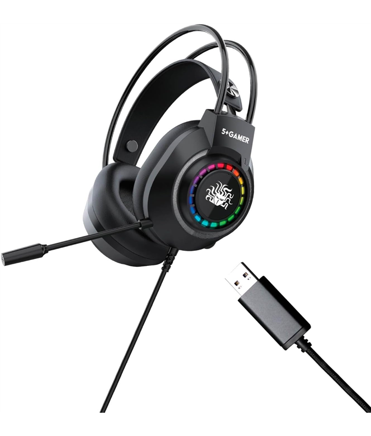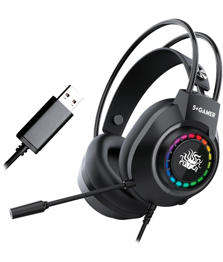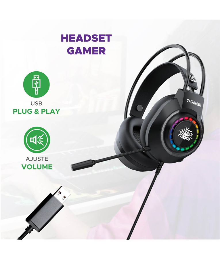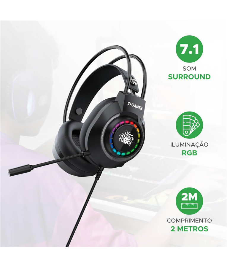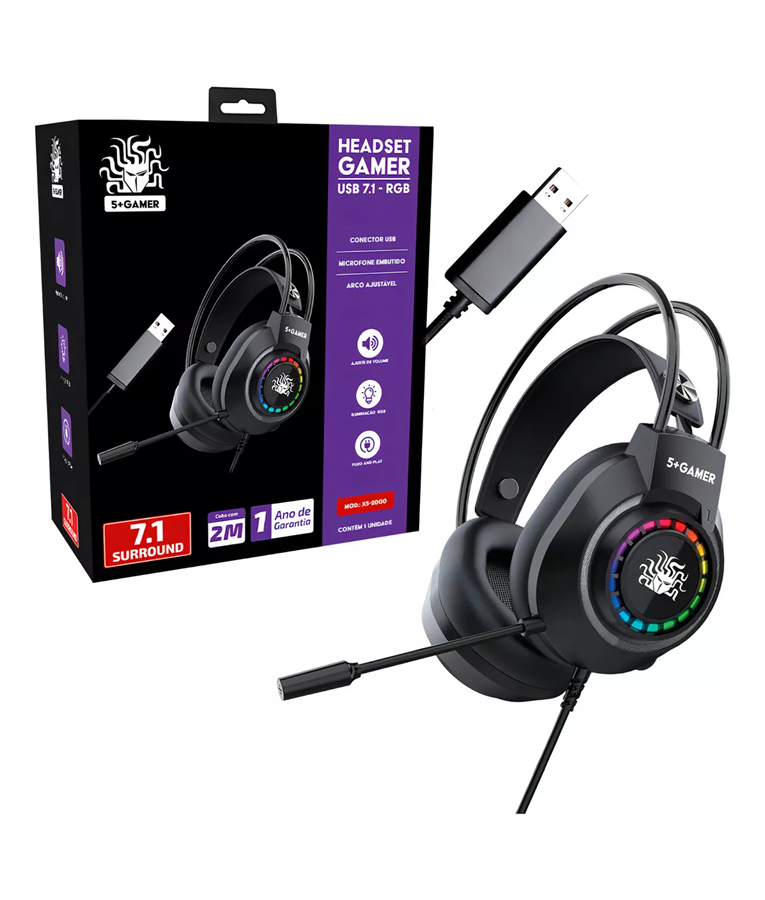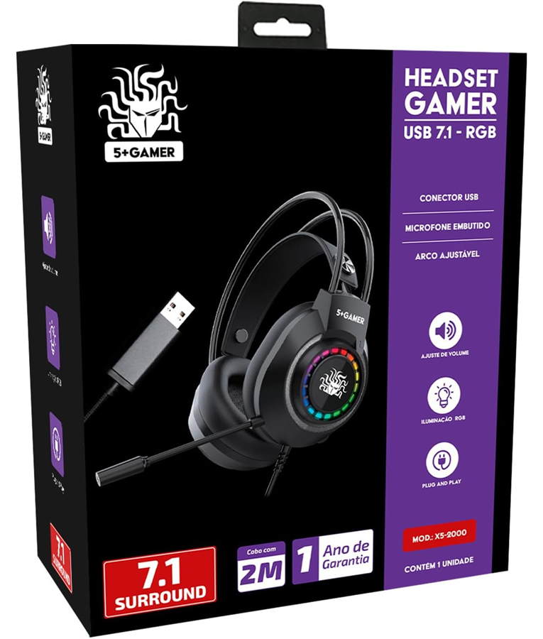 Descubra a incrível linha de headsets 5+ Gamer e eleve seus jogos para o próximo nível! Uma fusão perfeita de tecnologia e durabilidade. Com um design arrojado e confortável, o Headset Gamer 7.1 RGB 5 - X5-2000 proporciona desempenho e performance superiores durante suas sessões de jogos.