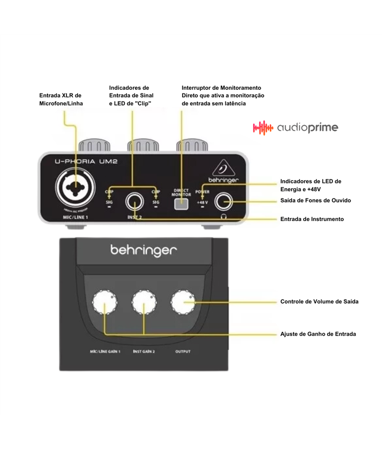 A U-PHORIA UM2 é uma interface de áudio USB compacta e fácil de usar, com qualidade de gravação de 48 kHz. Ela possui um pré-amplificador de microfone XENYX de estúdio, uma entrada combinada XLR/TRS para vocais ou entrada de linha, além de uma entrada de instrumento de1/4"", dispensando o uso de uma DI box. Com alimentação via USB, monitoramento direto e design ultra-portátil, é ideal para músicos solo que querem gravar com qualidade profissional.