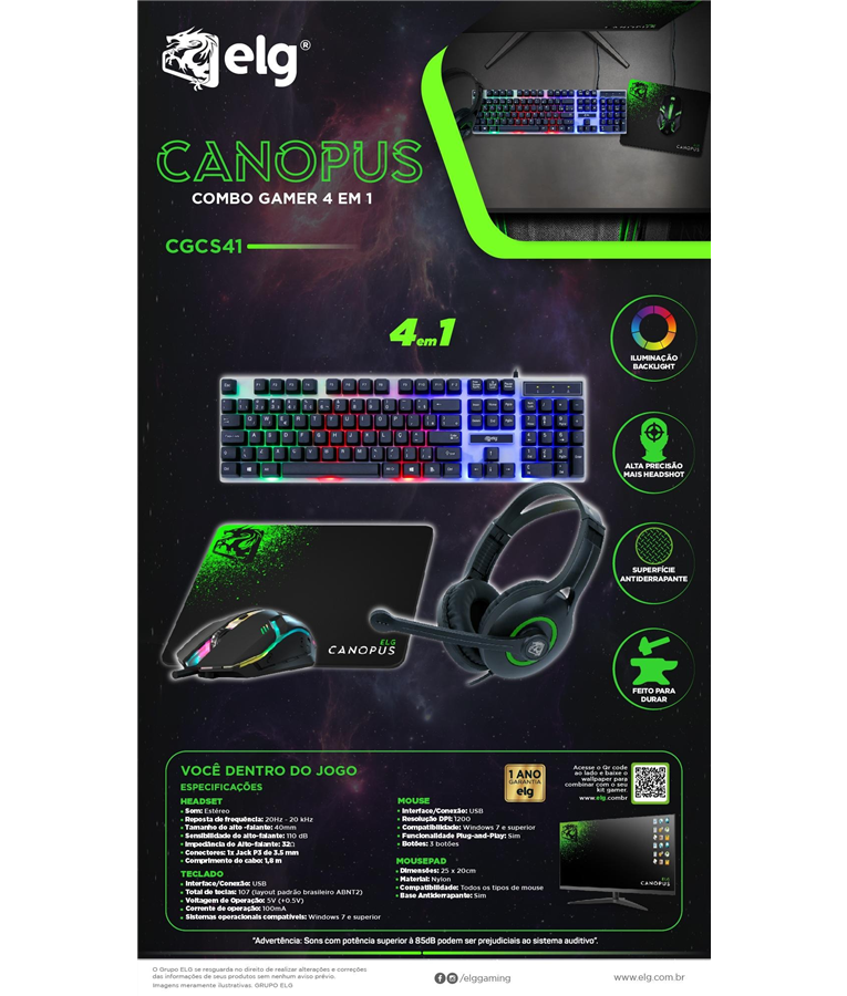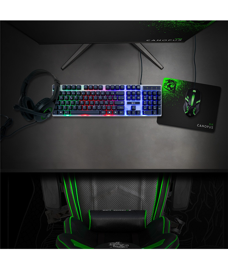 O Combo Canopus 4 em 1 é um Kit Gamer completo com teclado, mouse, headset e mousepad, todos projetados para oferecer a melhor experiência de jogo, ideal para jogadores que buscam desempenho e estilo. Com iluminação LED e design ergonômico, você estará pronto para qualquer desafio nos jogos FPS, MOBA e MMO.