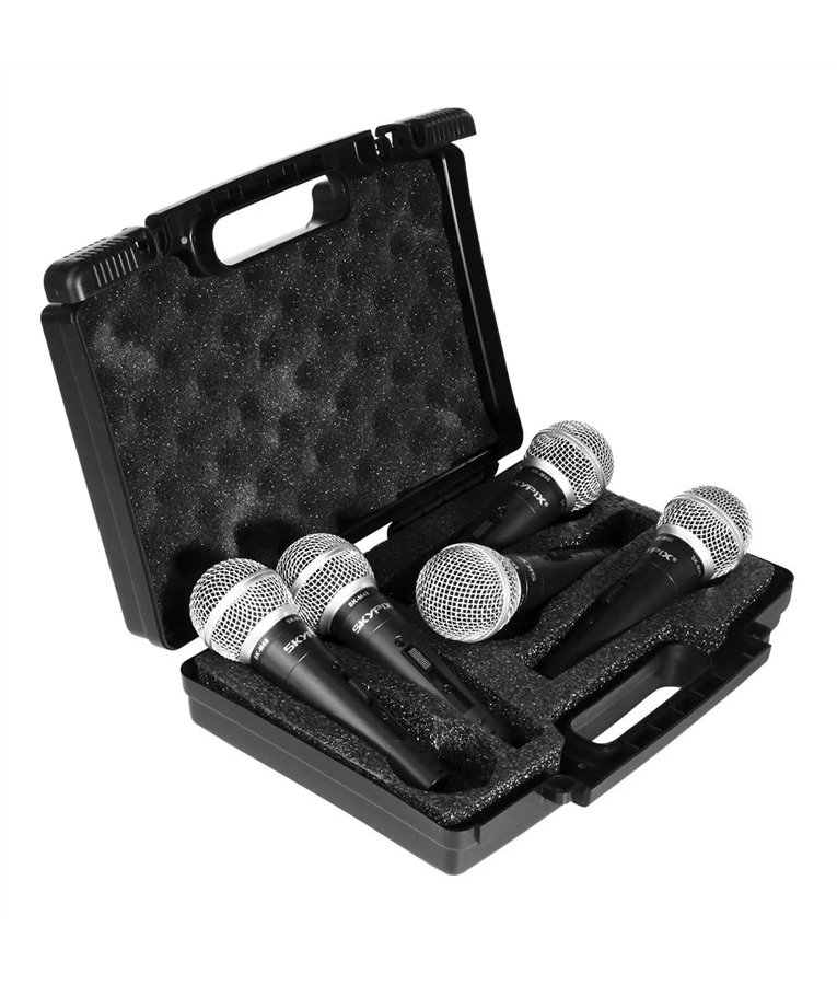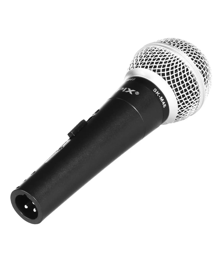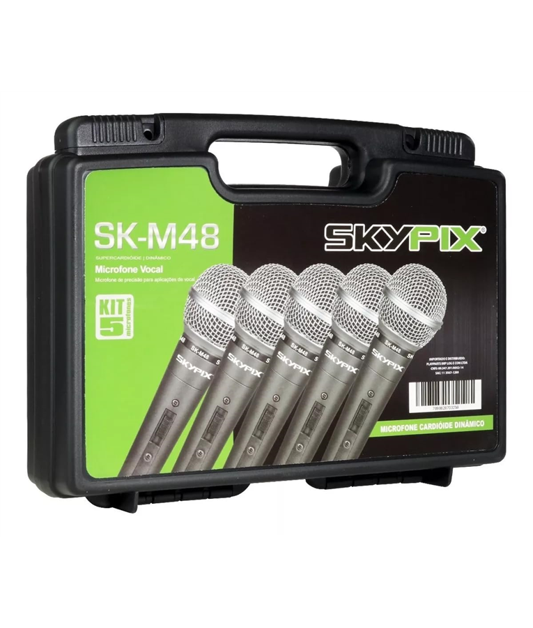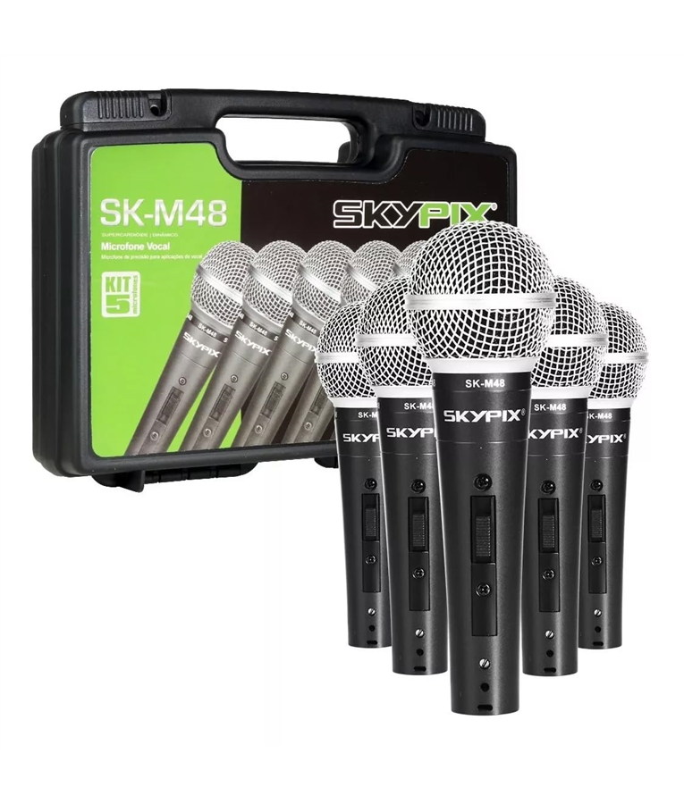 Kit de 5 Microfone com fio SK-M48 Dinâmico O Microfones com chave de liga/desliga SK-M48 da Skypix é ideal para igrejas, discursos, palestras, karaokê, apresentações ao vivo ou em estúdios e diversos outros eventos de sua preferência. O seu tamanho pequeno e de material robusto e de altíssima qualidade proporciona um confortável e ideal uso para qualquer ocasião, tornando seus eventos muito mais profissionais e atrativos para seu público. Especificações: - Microfone dinâmico; - Chave: ON/OFF; - Cardióide; - Corpo robusto em metal; - Formato de microfone: Mão; - Globo: Metálico, Impedância: 600 - Sensibilidade: -52dB, 3dB; - Resposta de frequência: 60Hz - 12kHz; - Conector: XLR-M 3 pinos e P10.