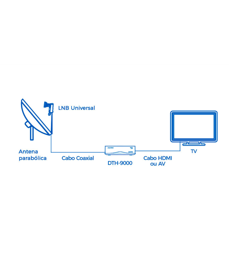 Um LNB (Low Noise Block) é um dispositivo eletrônico utilizado em antenas parabólicas de recepção de sinal de TV por satélite. Ele é responsável por converter o sinal de alta frequência recebido pela antena em um sinal de frequência mais baixa, que pode ser processado pelo Receptor de Sinal de TV DTH-9000.