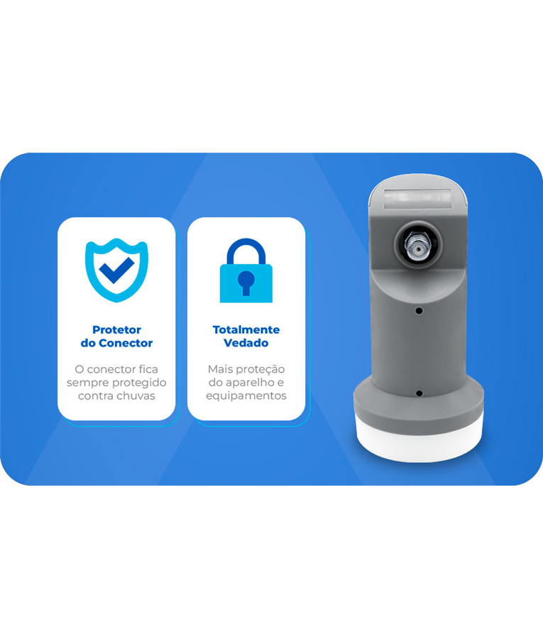 Um dos grandes diferenciais do LNBF da Aquário é sua proteção do conector do cabo, ele possui protetor no conector para que o equipamento fique sempre protegido contra chuvas ou outras situações climáticas adversas.