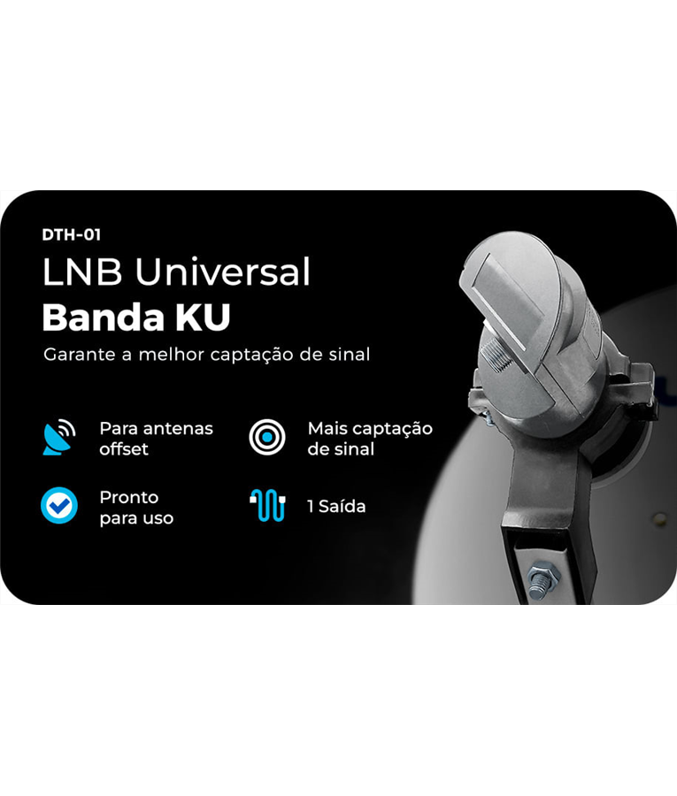 Parte fundamental das antenas offset, as famosas antenas parabólicas via satélite, o LNBF Universal garante a melhor captação de sinal para receptores de satélite da Banda KU, de operadoras como SKY, Claro, entre outras. O equipamento é produzido com plástico com tratamento UV, que garante alta resistência e durabilidade, principalmente em ambientes externos.