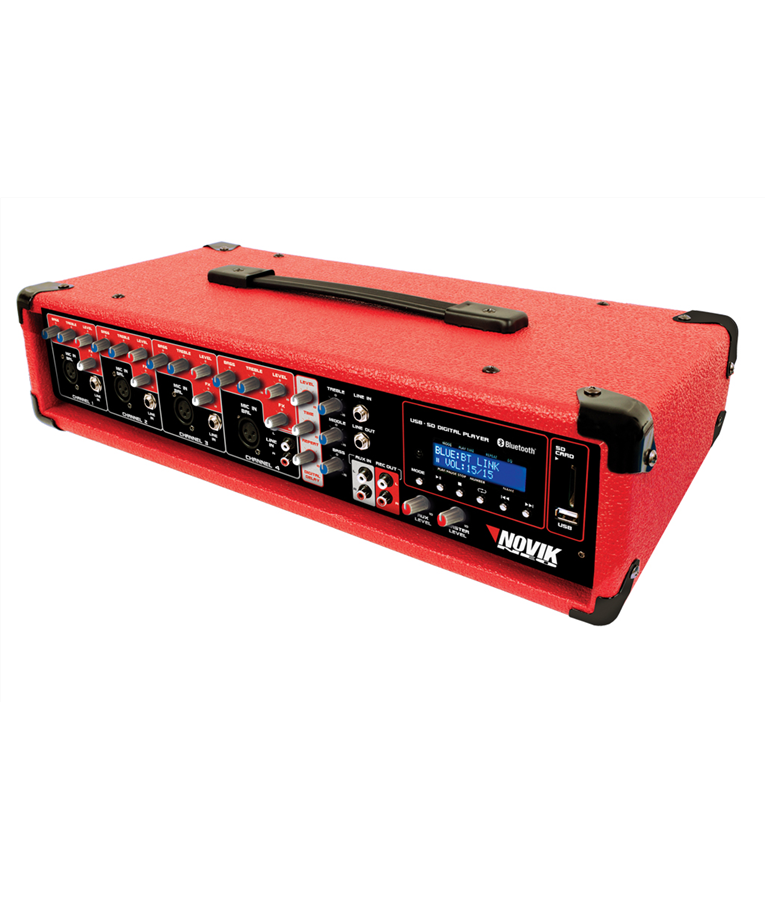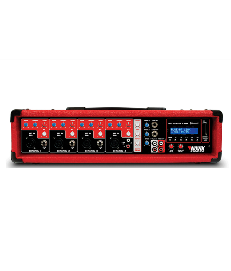 Descrição A linha de cabeçotes amplificados da NOVIK oferecem versatilidade e maior praticidade, com mixer com construção robusta e recursos como MP3 Player, Bluetooth e efeito. Principais Características Mixer multi-canais amplificado MP3 Player com Entradas USB/SDCard Visor LCD e Controle Remoto incluso Bluetooth Efeito de Delay Digital EQ Gráfico de 5 Bandas Especificações Técnicas Entrada de Microfone XLR Balanceada x4 Impedância de Entrada de Microfone 2.6k Balanceada Nível Máx. Entrada MIC 12dBu 10dB / Ganho Faixa de Ganho de Microfone 10dB/ 60dB Entrada de Linha / LINE P10 - 1/4? TRS Balanceada x4 Impedância de Entrada de Linha 20k Balanceada Nível Máx. Entrada LINE 19dBu 6.8V / Ganho mín. 1kHz antes de distorção Faixa de Ganho de Linha 22 dBu 0dB / Ganho Relação Sinal/Ruído 111dB Distorção / THD N 0.005% / 0.004% - curva A Resposta de Frequência <10Hz-150kHz / -1dB EQ Gráfico de 5 Bandas / Master 60Hz, 250Hz,1kHz, 4kHz,12kHz / ±12dB EQ por canal Grave 60Hz/± 15dB / Agudo 10kHz/±15dB Saída Master / Main Output P10 - 1/4 ? TRS Balanceada Efeito Digital Delay MP3 Player Sim Formatos de arquivo compatíveis MP3, WAV, WMA Potência RMS 150W 4 Ohms Potência de Programa 300W 4 Ohms Potência Máx. 600W 4 Ohms Carga mínima de impedância por canal 4 Ohms Voltagem 110V/220V ~ 60Hz/50Hz Consumo de energia 300W