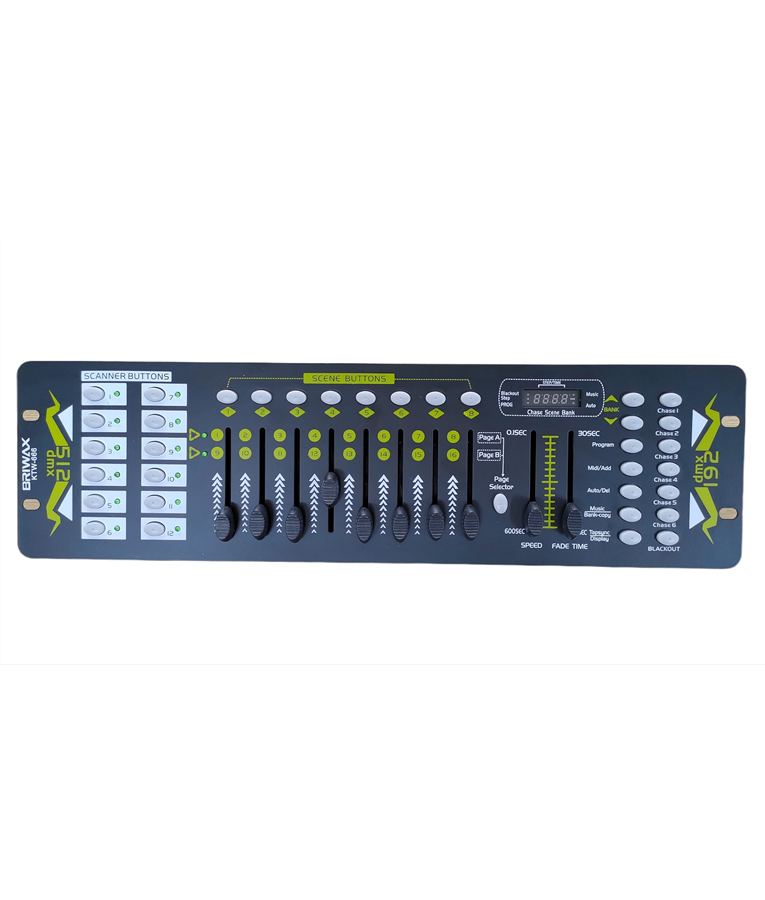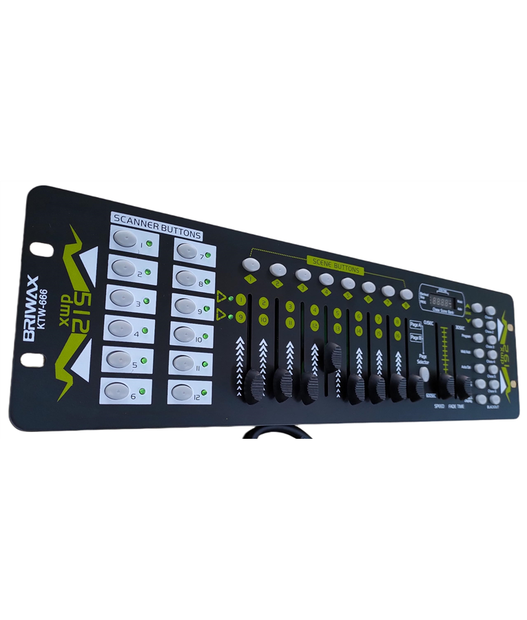 Mesa controladora Dmx Profissional Operator l, com ela você poderá controlar qualquer tipo de equipamentos como movings, strobos, refletores, máquinas de fumaça entre outros. Dentre as funções da mesa Operator I você poderá controlar até 12 aparelhos com 16 canais cada simultaneamente, além de possuir uma memória para 30 programas com 8 cenas ou 6 chases com até 240 cenas cada. Possui dois discos de controle, função - Blackout, Fade Time e Midi Control, disponibilidade de entrega imediata. -- INFORMAÇÕES TÉCNICAS. Cor: Preto; -Modelo: DMX512; -Material: Metal / ABS; -Voltagem: AC 110V 220V (BIVOLT); -Frequência: 50/60Hz; -192 Canais DMX; -Controla Simultaneamente até 12 Aparelhos com 16 Canais cada; -Memória para 30 Programas com 8 Cenas cada; -São 240 Cenas no Total; -Controla Aparelhos com até 16 Canais DMX; -Grava até 8 Cenas Diferentes na Configuração; -Display Digital: LxA (3,6 x 1,7) cm; -Painel Scanner Buttons: 12 Botões com LED; -Painel Scene Buttons: 8 Botões; -Função Blackout; -Comprimento do Cabo da Fonte: 100cm. ITENS INCLUSOS -- 1 Mesa DMX 512 1 Fonte de Energia (BIVOLT) 1 Manual de Instruções