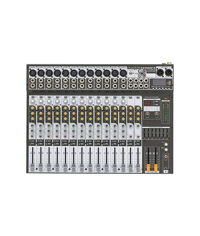 A mesa de som SoundCraft SX 1602 FX USB é um mixer analógico de última geração, que agora conta com reprodução de arquivos em MP3 via USB. Possui dezesseis canais, sendo doze para entrada mono XLR, dois canais com entradas estéreo e mais dois auxiliares.