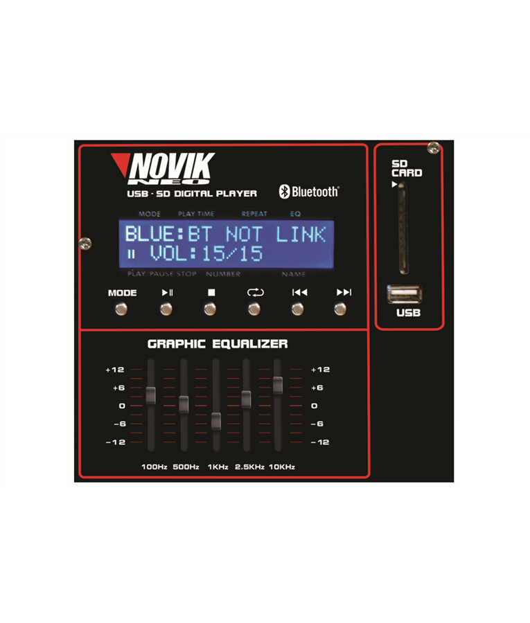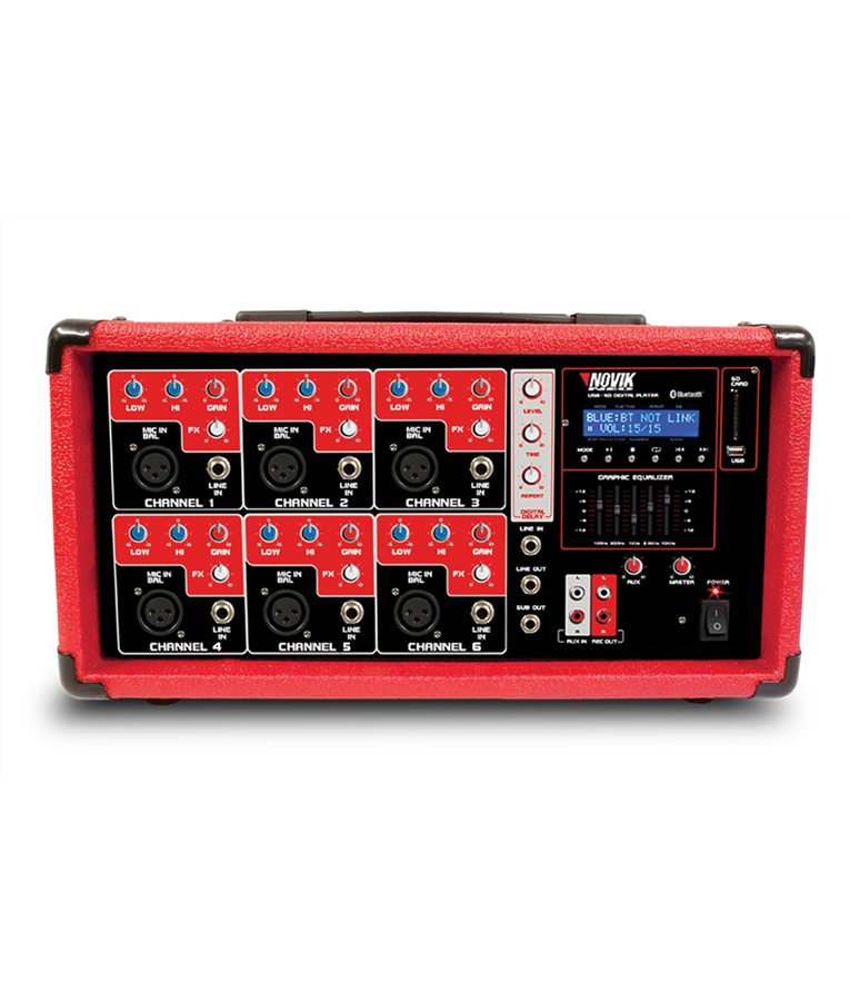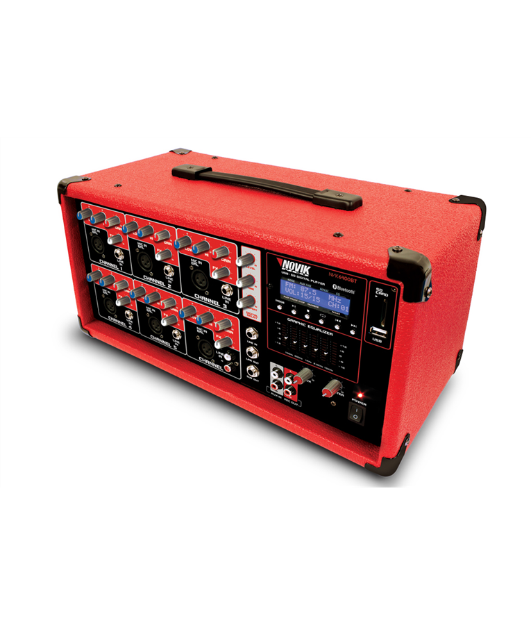 Descrição: A linha de cabeçotes amplificados da NOVIK oferecem versatilidade e maior praticidade, com mixer com construção robusta e recursos como MP3 Player, Bluetooth e efeito. Principais Características Mixer multi-canais amplificado MP3 Player com Entradas USB/SDCard Visor LCD e Controle Remoto incluso Bluetooth Efeito de Delay Digital EQ Gráfico de 5 Bandas Especificações Técnicas: Entrada de Microfone XLR Balanceada x6 Impedância de Entrada de Microfone 2.6k Balanceada Nível Máx. Entrada MIC 12dBu @ 10dB / Ganho Faixa de Ganho de Microfone 10dB/ 60dB Entrada de Linha / LINE P10 - 1/4? TRS Balanceada x6 Impedância de Entrada de Linha 20k Balanceada Nível Máx. Entrada LINE 19dBu 6.8V Ganho mín. 1kHz antes de distorção Faixa de Ganho de Linha 22dBu 0dB / Ganho Relação Sinal/Ruído 111dB Distorção / THD N 0.005% / 0. 004% - curva A Resposta de Frequência <10Hz-150kHz / -1dB EQ Gráfico de 5 Bandas / Master 60Hz, 250Hz, 1kHz, 4kHz,12kHz / ±12dB EQ por canal Grave 60Hz/± 15dB / Agudo 10kHz/±15dB Saída Master / Main Output P10 - 1/4? TRS Balanceada Efeito Digital Delay MP3 Player Sim Formatos de arquivo compatíveis MP3, WAV, WMA Potência RMS 200W 4ohms Potência de Programa 400W 4ohms Potência Máx. 800W 4ohms Carga mínima de impedância por canal 4ohms Voltagem 110V/220V ~ 60Hz/50 Hz Consumo de energia 400W