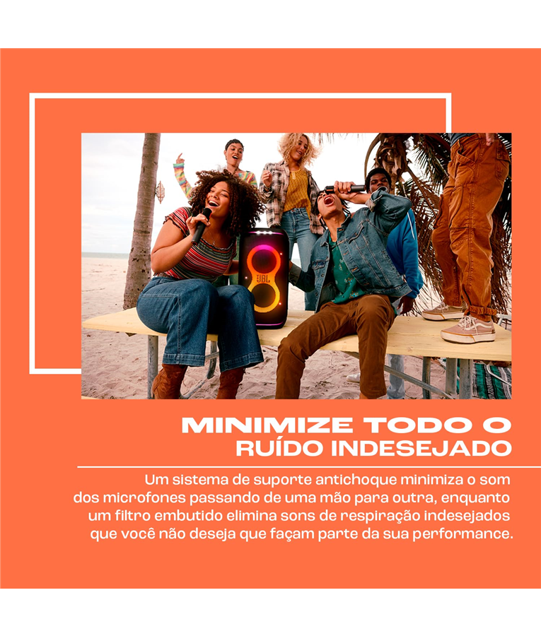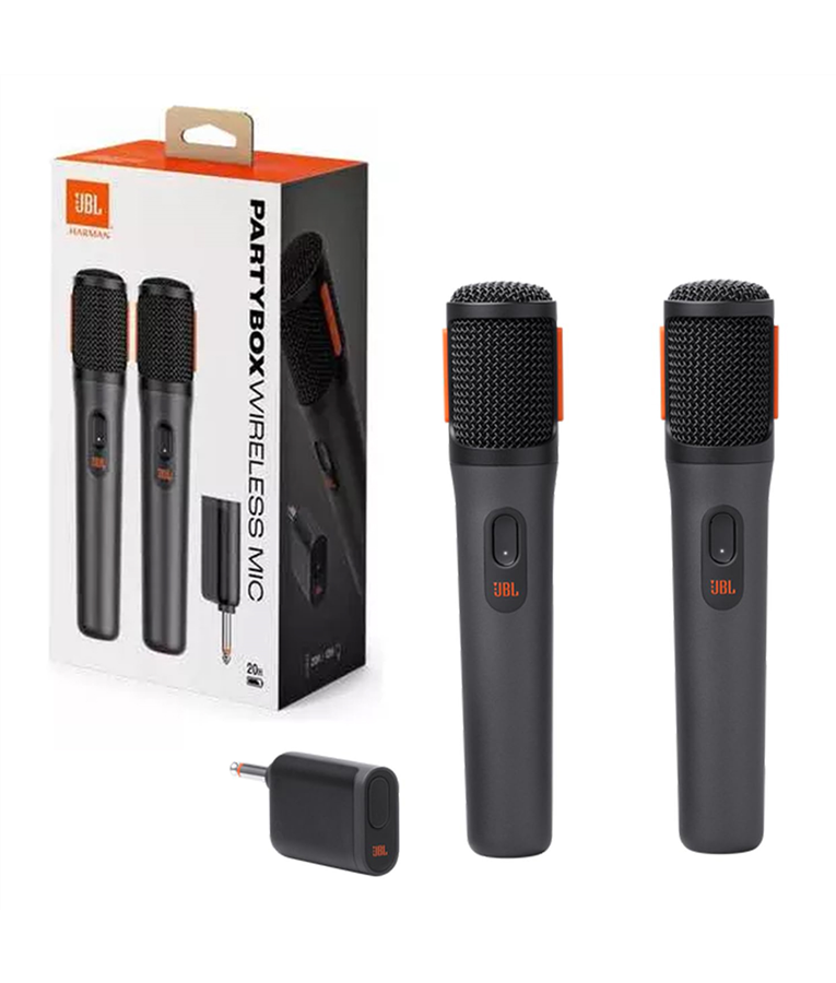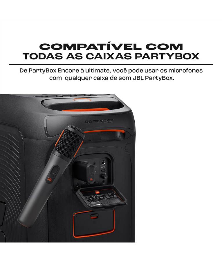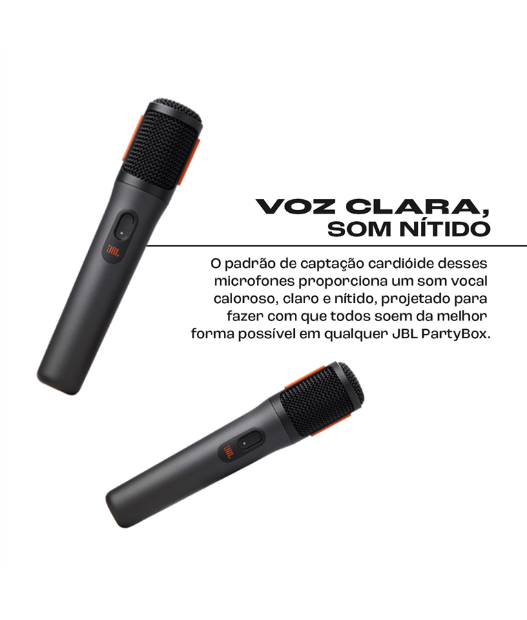 Detalhes do produto Chegou a sua hora de ser o centro das atenções. Os microfones sem fio da JBL oferecem o original JBL Pro Sound com clareza e detalhe vocal. Aproveite a melhor qualidade de som e alcance as notas altas sem distorção ou atraso. Basta conectar o receptor de canal duplo sem fio à caixa de som, ligar os microfones e você estará pronto para brilhar. Pilhas AA de fácil substituição, para que você possa soltar todas as notas até o sol nascer. Hora de um dueto? Você ouvirá os dois microfones combinados perfeitamente na caixa de som. Prepare-se para ser o centro das atenções. Qual o conteúdo da caixa? 2 microfones sem fio 1 receptor sem fio Cabo USB-C Guia de início rápido Ficha de segurança Certificado de garantia Especificações Gerais: Distância entre o transmissor e o receptor> 10 m Padrão polar: Cardioide Resposta de frequência: 65 Hz a 15 kHz Relação sinal-ruído (S/N)60 dBA Banda de frequência UHF470-960 MHz (depende do SKU)(EU 657-662 MHz) THD0,5%, típico Alcance dinâmico: 100 dB, ponderação A, típico Potência do transmissor< 10 mW, típica Entrada do receptor1/4"""""""" (6,3 mm) não balanceada Nível máximo de saída do receptor-13 dBV, típico Bateria recarregável do receptorpolímero de íon de lítio 3,7 WH (equivalente a 3,7 V, 1000 mAh) Tempo de carga do receptor: 2 horas a 5 V, 1 A Bateria do receptor Tempo de reprodução: até 6 horas Bateria do microfone: 4 alcalinas AA (incluídas) Dimensões: Dimensões (L x A x P)Microfone 50 x 233 mm/1,95"""""""" x 9,16""""""""; Receptor 70 mm x 80 mm x 20 mm/2,75"""""""" x 3,14"""""""" x 0,78"""""""" PesoMicrofone 235 g/0,52 lb; Receptor