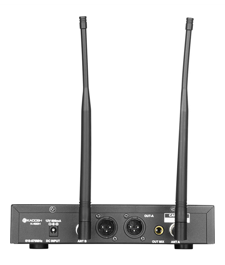 Alimentação: DC12V 1A Saídas XLR balanceadas A e B Saída P10 para mix canal A+B Duplo microfone de mão - Handhell Sincronização através de IR Distância entre TX e RX: 30M Display em LCD com informações básicas (Frequência, Grupo, Canal, AF, RF, aviso de pilhas com baixa carga) Antenas Omnidirecional 1/2 comprimento de onda.