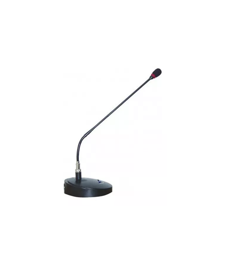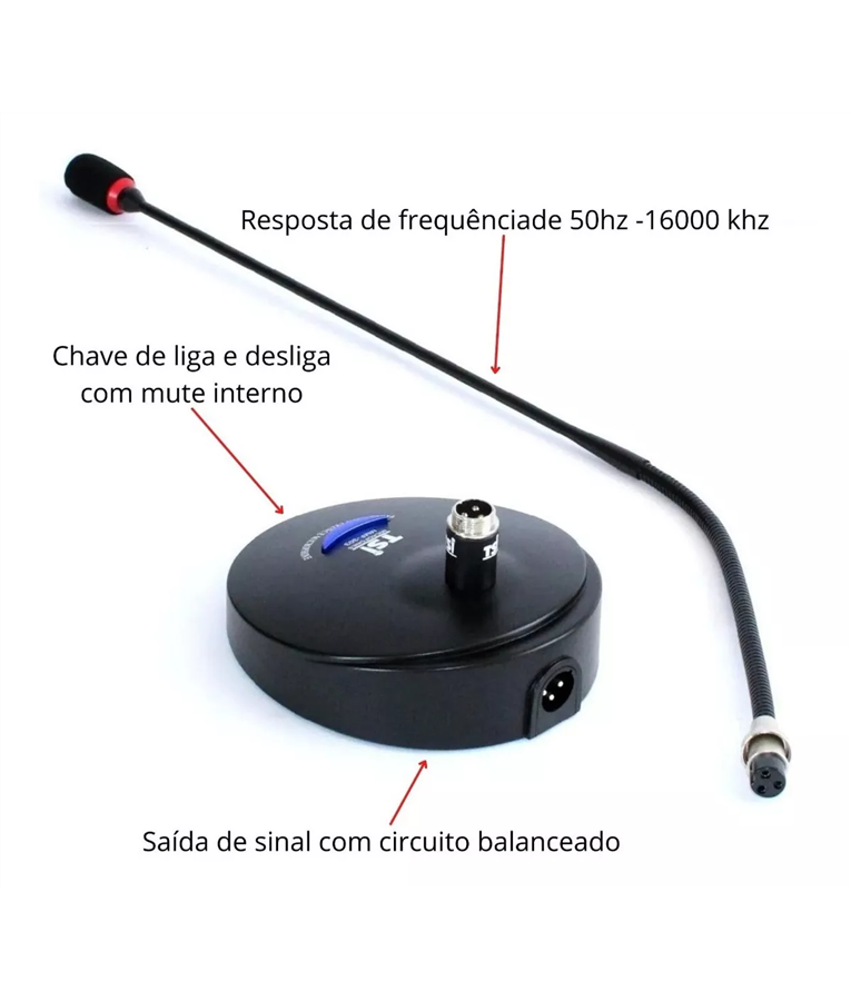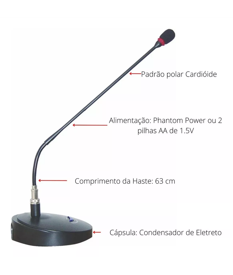 ? Com base para mesa e suporte flexível com cápsula de condensa- dor, saída XLR.