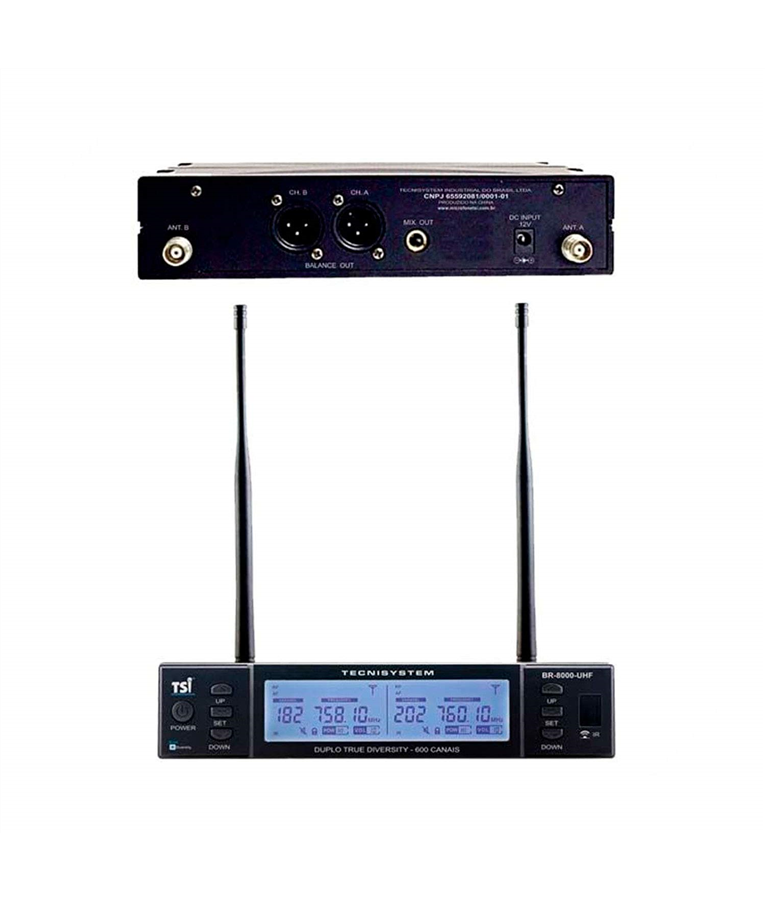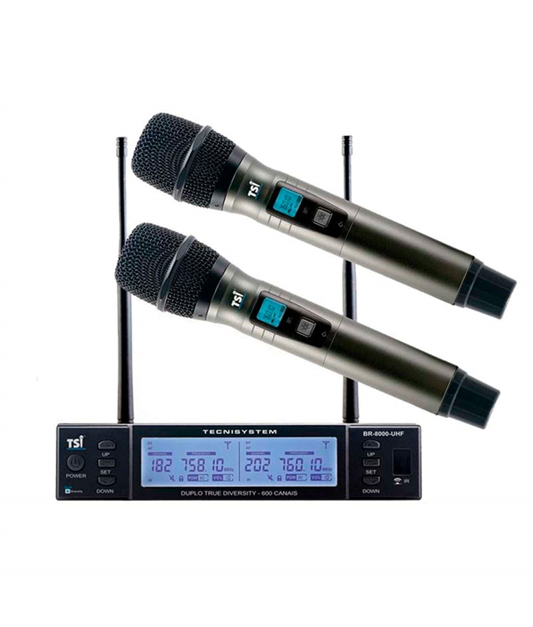 O Microfone TSI BR-8000-UHF é um sistema profissional de alta performance, composto por um conjunto de dois microfones sem fio e um processo de recepção duo-4 diversity (2x true diversity).