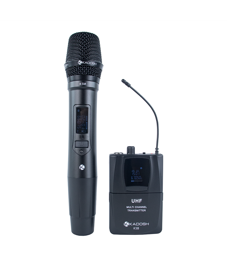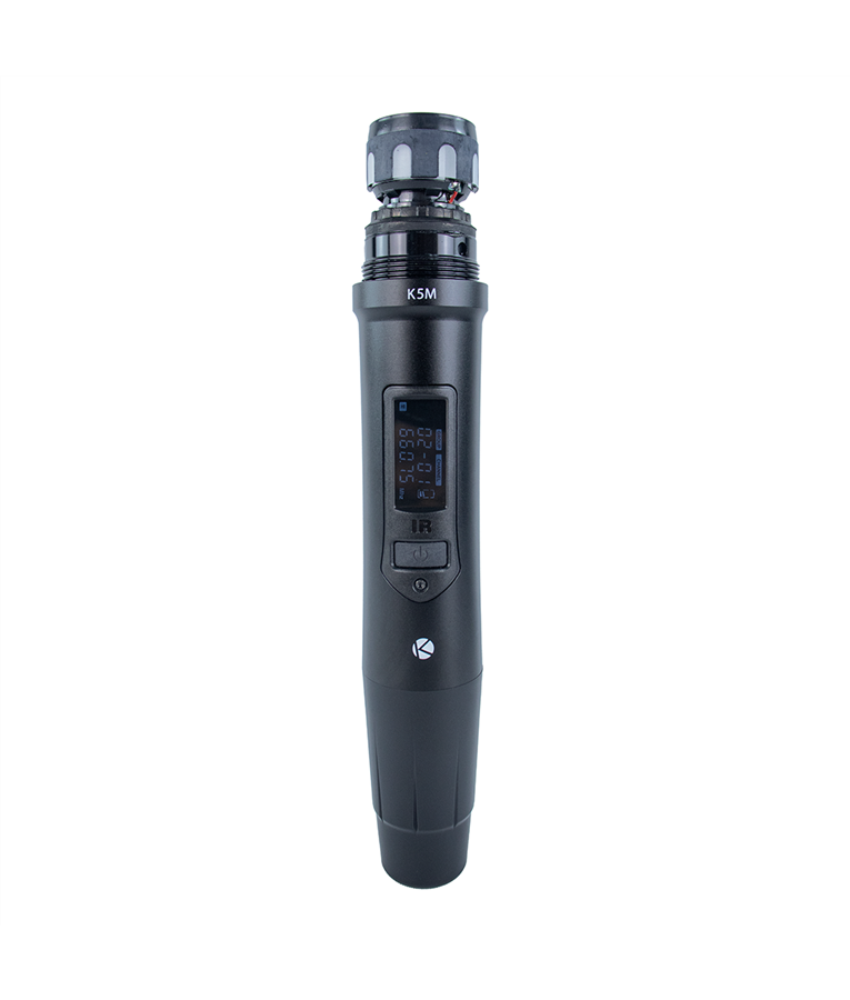 O Handheld K5m é extremamente confortável, graças aos seus 260g (já com a pilha). Feito em metal, pintura eletrostática e com acabamento em verniz fosco. No corpo do transmissor de mão você tem um display em OLED e botão com funções On / Mute / Off.