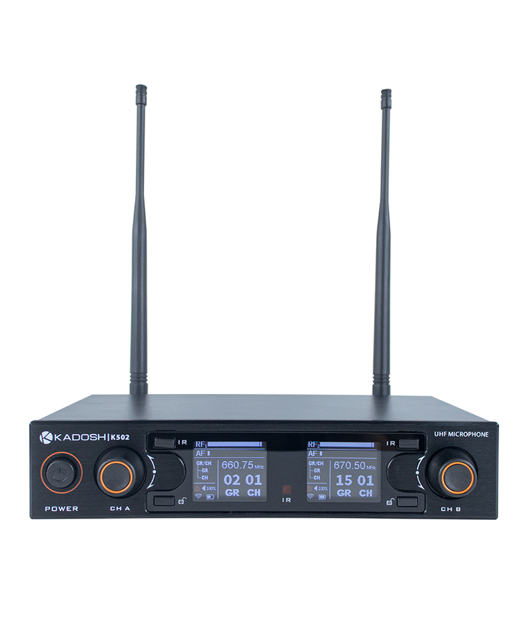 O K502 possui 100 frequências por canal, sendo administradas de forma que determinada frequência seja usada apenas por um canal, PLL - Phase Locked Loop, escaneamento de frequência, sync por IR (impulse response), conexão de antenas BNC. Possui 2 range de frequência, 660.000 MHz - 689.700MHz | 560.000MHz - 589.700MHz, dando a você possibilidade de usar outros sistemas no mesmo ambiente e em qualquer local.
