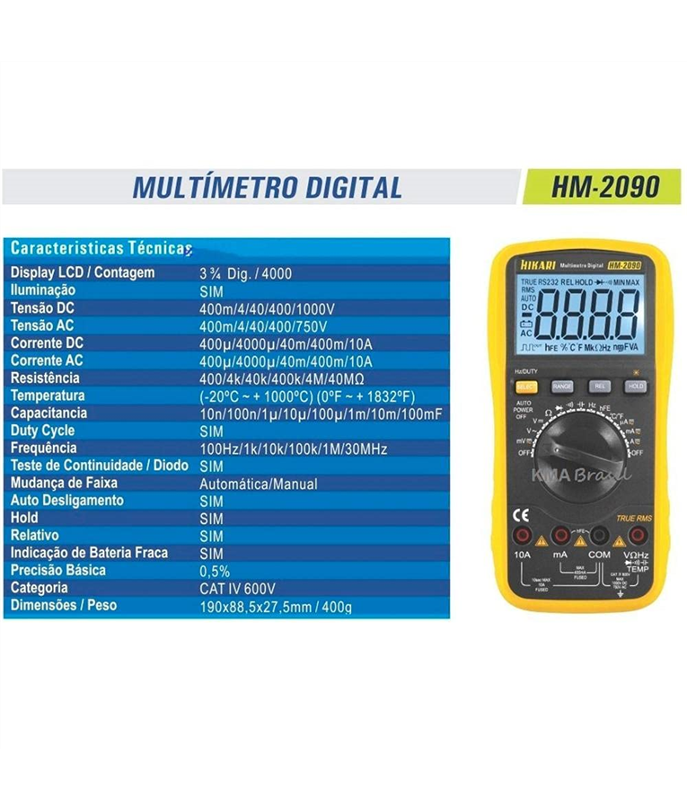 Como característica adicional apresenta visor LCD 3 ¾ dígitos com iluminação de fundo, TRUE RMS, modo relativo, modo Hold (congelamento de leitura), desligamento automático e mudança de faixa automática.