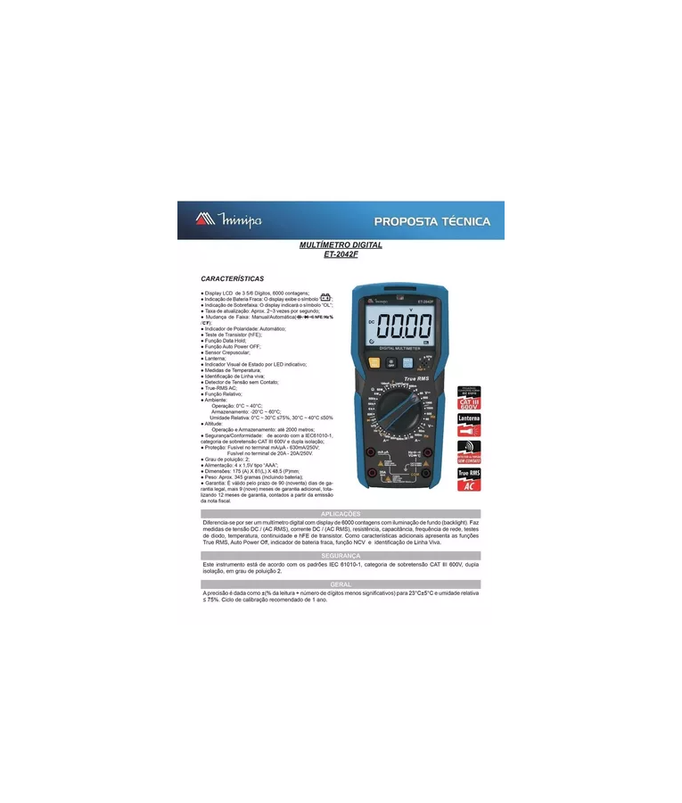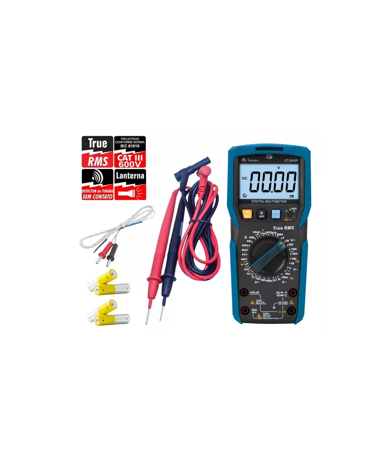 O Multímetro Digital ET-2042 da Minipa foi projetado para profissionais que necessitam de uma ampla gama de funções, podendo ser usado em laboratórios e ambientes de média potência desde que esteja de acordo com a sua categoria de segurança.