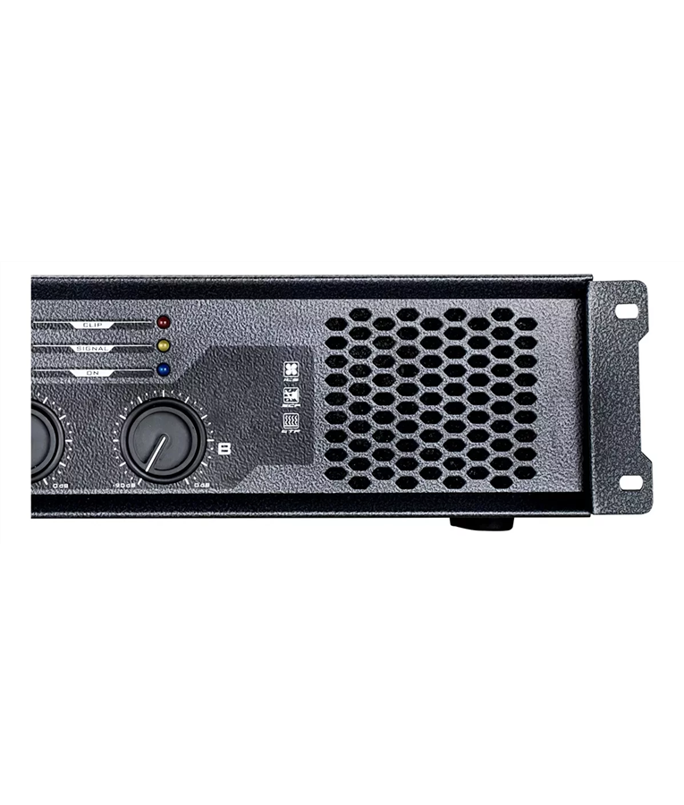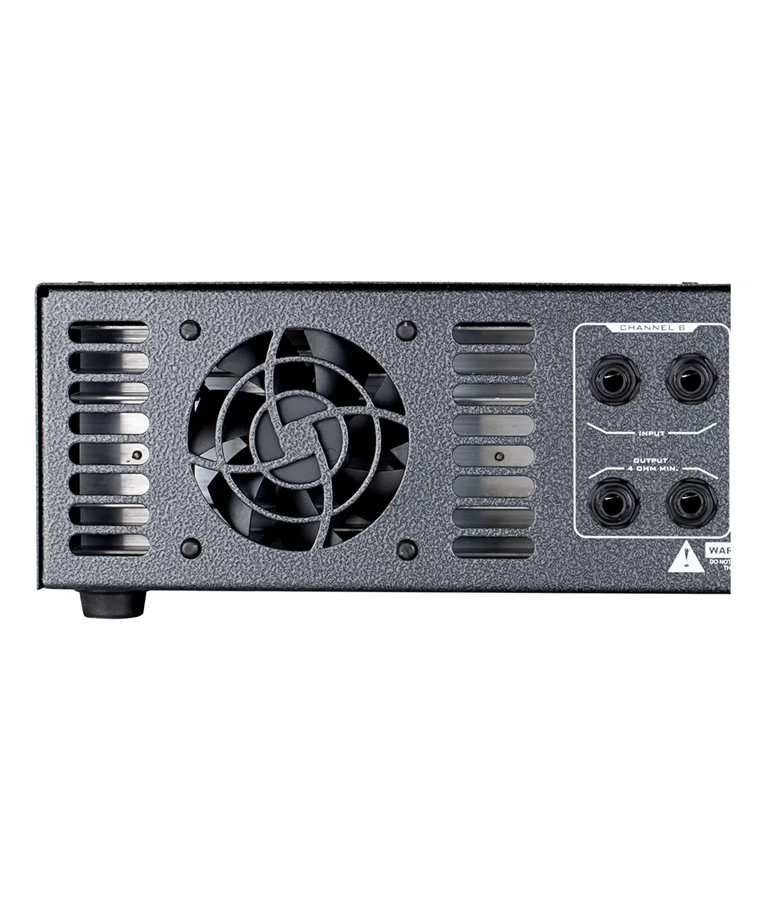 Este amplificador oferece vários recursos indispensáveis, em seu painel frontal você encontra duas alças de tração, uma no lado esquerdo e outra no lado direito, saída de ar do turbo dissipador no lado direito, controle de volume do canal A no lado esquerdo e controle de volume do canal B no lado direito, além dos 3 indicadores de LED para cada canal e um botão liga/desliga posicionado no lado esquerdo do aparelho, próximo ao controle de volume do canal A.