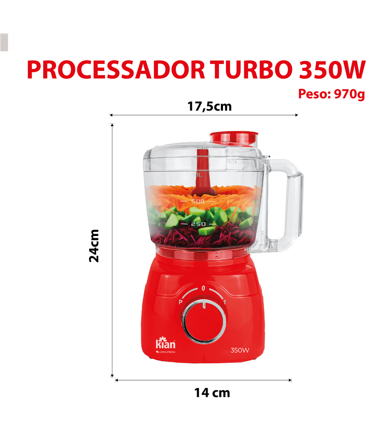 Compacto e eficiente, o Processador de Alimentos Turbo Kian prepara receitas com facilidade. Com 350W de potência e capacidade de 1L.