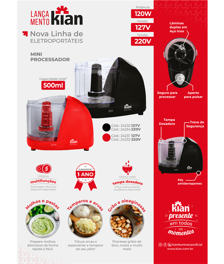 Conteúdo da embalagem: - 1 Mini Processador Kian 120W Preto 220v
