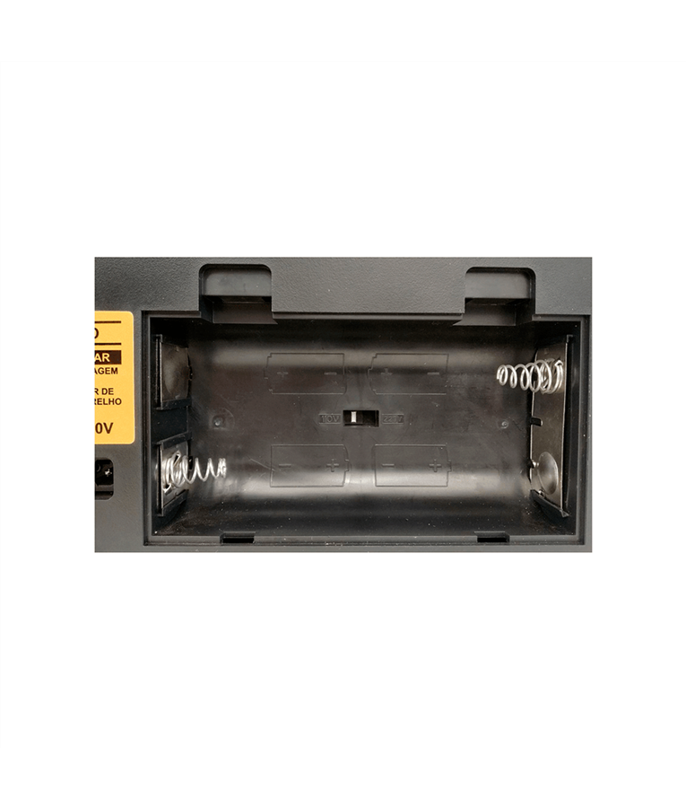 Alimentação: 4 Pilhas grandes (Tipo D) de 1,5 volts (não fornecidas) ou rede elétrica de 127 V AC ou 230 V AC (50/60 Hz).