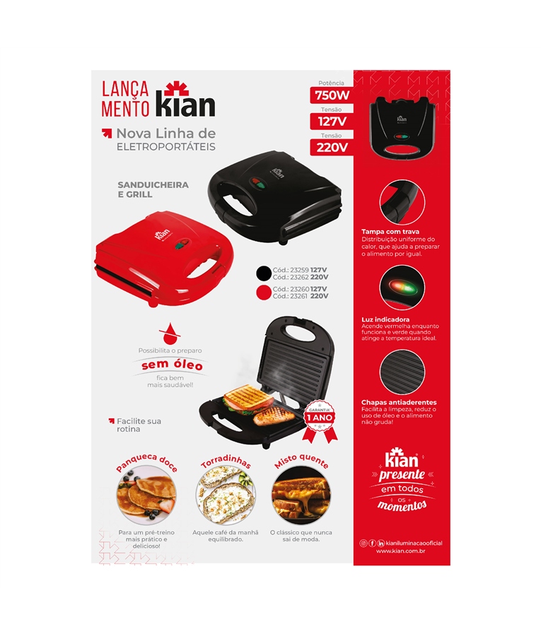 Desfrute de uma experiência gastronômica superior com a Sanduicheira e Grill 750W da Kian. Seja você um cozinheiro iniciante ou um chef experiente, este aparelho é a ferramenta ideal para elevar suas habilidades culinárias. Surpreenda sua família e amigos com pratos deliciosos e saudáveis, preparados com rapidez e facilidade. Transforme cada refeição em um momento especial com este elegante e eficiente grill.