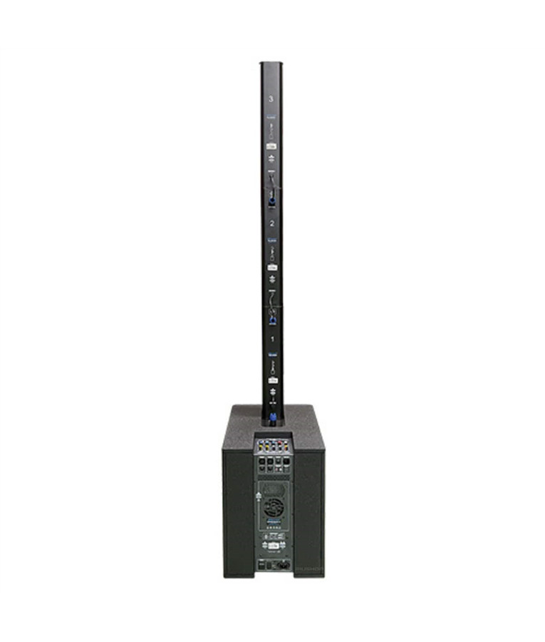 A torre principal possui uma configuração de alto-falantes de três vias, composta por um tweeter, um médio e um woofer, permitindo a reprodução clara e nítida de frequências altas, médias e baixas. Isso resulta em um som equilibrado e envolvente, que preenche o ambiente com clareza e potência.