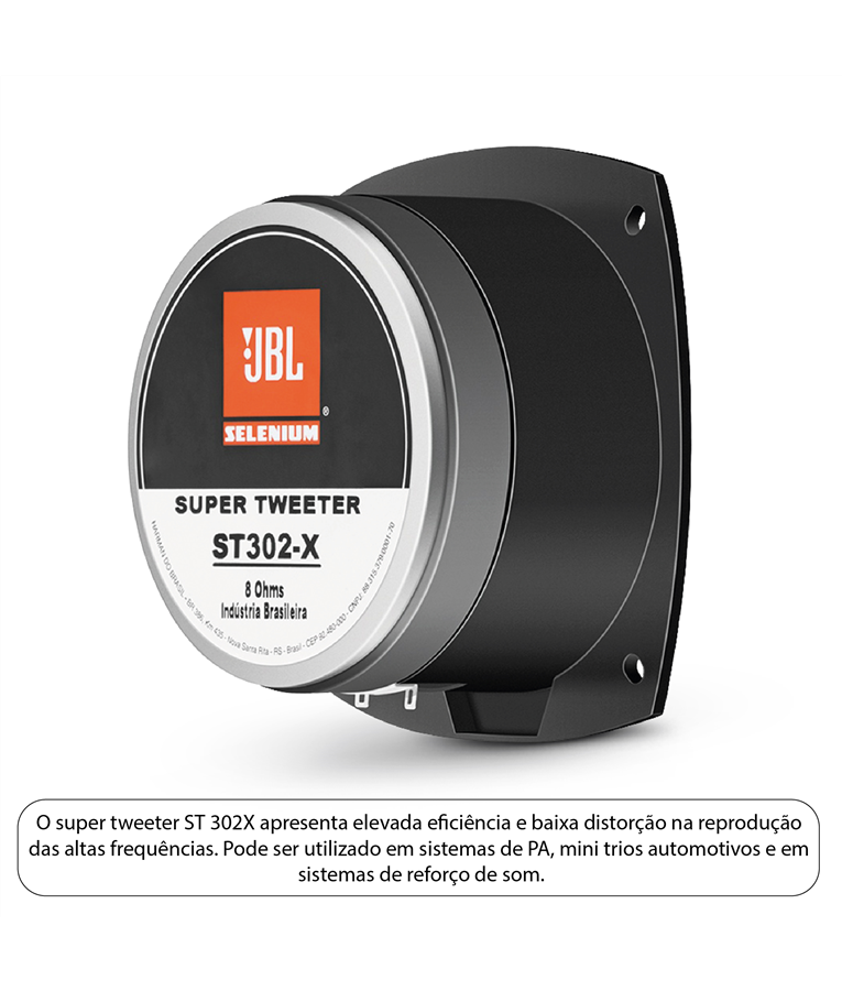 O super tweeter ST 302X apresenta elevada eficiência e baixa distorção na reprodução das altas frequências. Pode ser utilizado em sistemas de PA, mini trios automotivos e em sistemas de reforço de som. A base e o difusor são construídos em alumínio contribuindo assim para uma melhor dissipação de calor da bobina móvel, com um acabamento de usinagem diamantada ferramenta de diamante e envernizados. O ângulo de dispersão de sua corneta de 40x40 (HxV) é adequada para atingir longas distâncias. Seu diafragma fenólico reproduz os agudos com um timbre agradável. A bobina é construída em forma de kapton e enrolada com fio do tipo CCAW (copper clad aluminium wire) resistente as altas temperaturas.Conjunto magnético com anel de alumínio garantindo uma alta definição e eficiência em toda sua faixa de reprodução.
