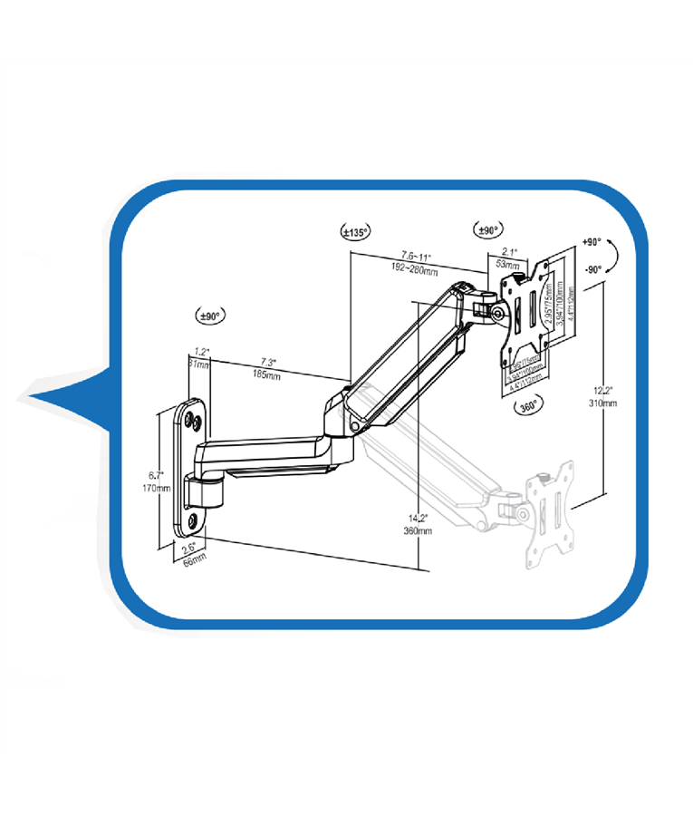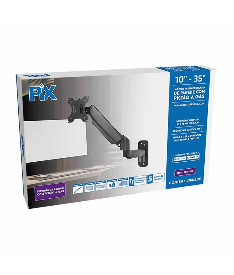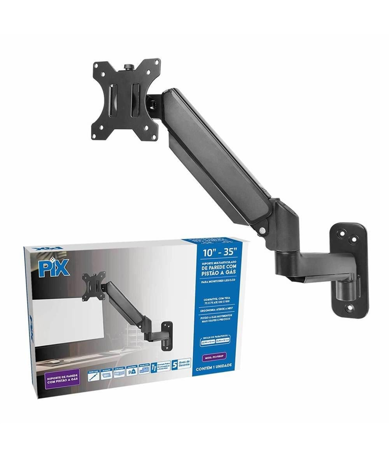 O suporte de parede PX-F150P é uma solução robusta e prática para monitores LED/LCD de 10 a 35 polegadas. Equipado com pistão a gás, oferece movimentos suaves e precisos, permitindo inclinação de até 180 graus e articulação de 270 graus, ajustando-se às necessidades ergonômicas conforme a NR17. Compatível com o padrão VESA 75 x 75 e 100 x 100, suporta até 9 kg, garantindo estabilidade e flexibilidade no ajuste de ângulo.