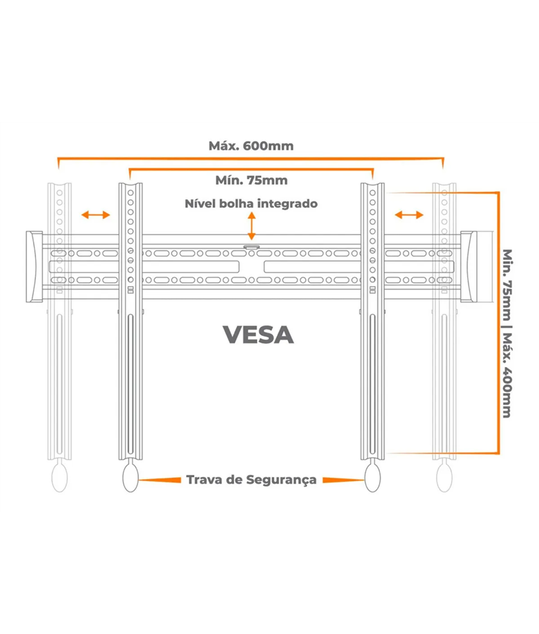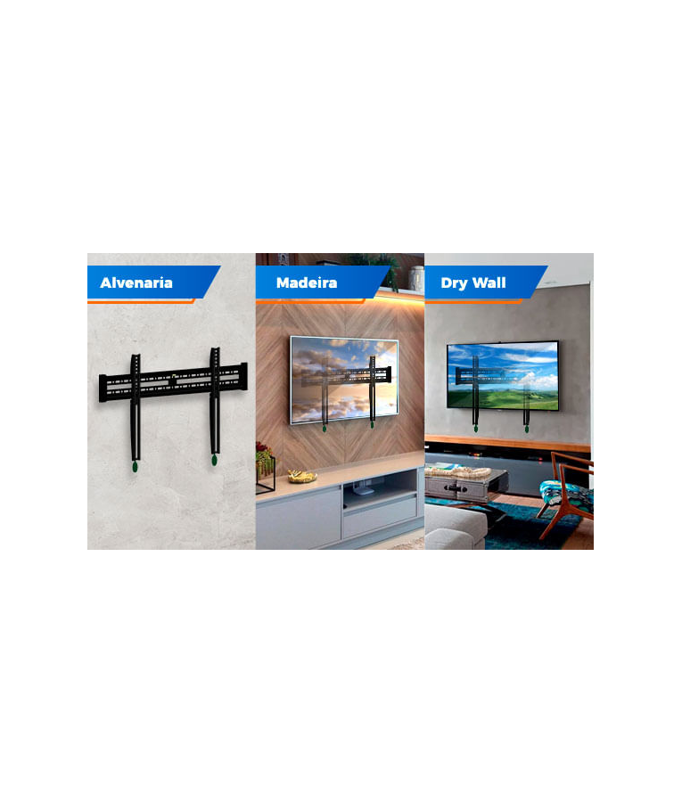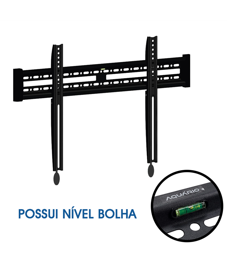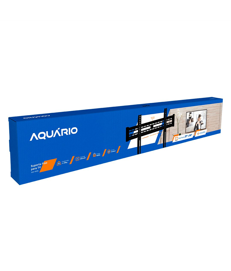 Suporte para TV Fixo com trava de segurança. Alta segurança em um Design Ultra Slim! O Suporte para TV SAV-1006 conta com um design moderno, compacto e ultra slim, que permite a instalação mais rente à parede para deixar os ambientes ainda mais organizados. Além de ser feito com materiais de alta resistência (aço carbono com tratamento anticorrosivo) e ter uma estrutura reforçada para evitar acidentes, o Suporte ainda conta com engate rápido e trava automática, para fácil conexão dos dois elementos verticais e a trava garante ainda mais segurança, após ouvir um 'click' o aparelho estará preso para não se preocupar com quedas ou falhas, seja por crianças, pessoas esbarrando ou até mesmo quando o local estiver em limpeza. Ele possui alças que podem ser desarmadas puxando corretamente a trava. ? Kit de Instalação Completo O Suporte Fixo para TV da Aquário já conta com todos os principais acessórios para facilitar a instalação (buchas, parafusos, arruelas, além do manual). ? Carga máxima de 50Kg O Suporte Universal para TV suporta até 50Kg de peso, desde que sejam observadas as condições da parede ou painel que ele será instalado e que a instalação seja feita corretamente. ? Para todos os tipos de TVs e Monitores O Suporte Universal possui engate rápido e é compatível com todos os tipos de TVs e monitores disponíveis no mercado. PADRÃO VESA (MM): 200x200 200x300 300x200 300x300 400x200 400x300 400x400 LOCAIS DE INSTALAÇÃO: Parede alvenaria, Painéis Drywall e Madeira POLEGADAS SUPORTADA: 37 a 80"""" INSTALAÇÃO DO SUPORTE: Encaixe Rápido com Trava automática MATERIAL: Aço Carbono com pintura resistente, epóxi eletrostática (anticorrosiva) DISTÂNCIA MÍNIMA DA PAREDE: 3 cm PESO MÁXIMO SUPORTADO: 50 Kg PESO DO PRODUTO: 1,5 Kg