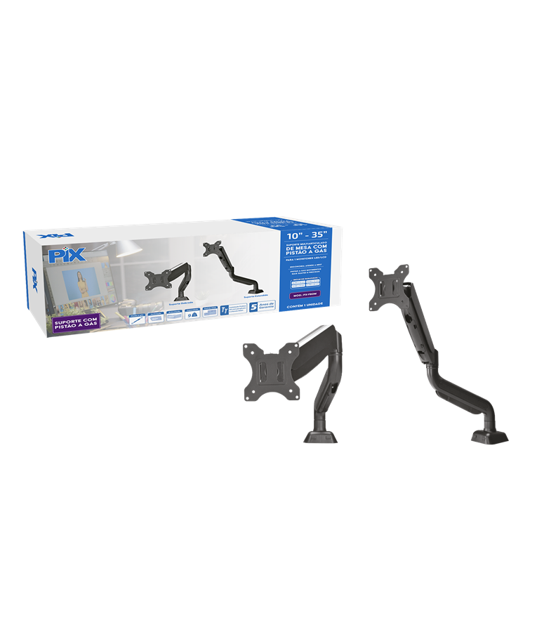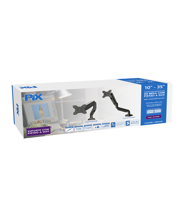 O suporte px-f80m é uma solução prática e ergonômica para quem utiliza um monitor led/lcd de 10 a 35 polegadas. Com sistema de pistão a gás, ele permite movimentos mais suaves e precisos, oferecendo inclinação de até 90 graus e articulação de 360 graus para ajuste ideal da posição de trabalho. Compatível com o padrão vesa, o suporte é robusto, suportando até 9 kg. Sua estrutura atende à nr17, proporcionando conforto e ergonomia.
