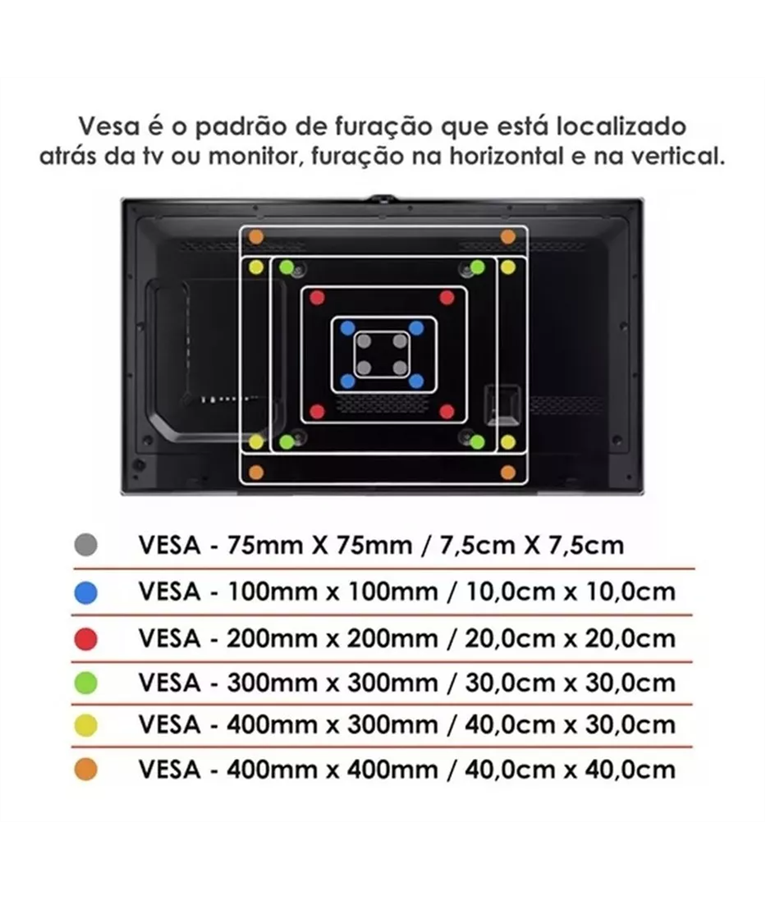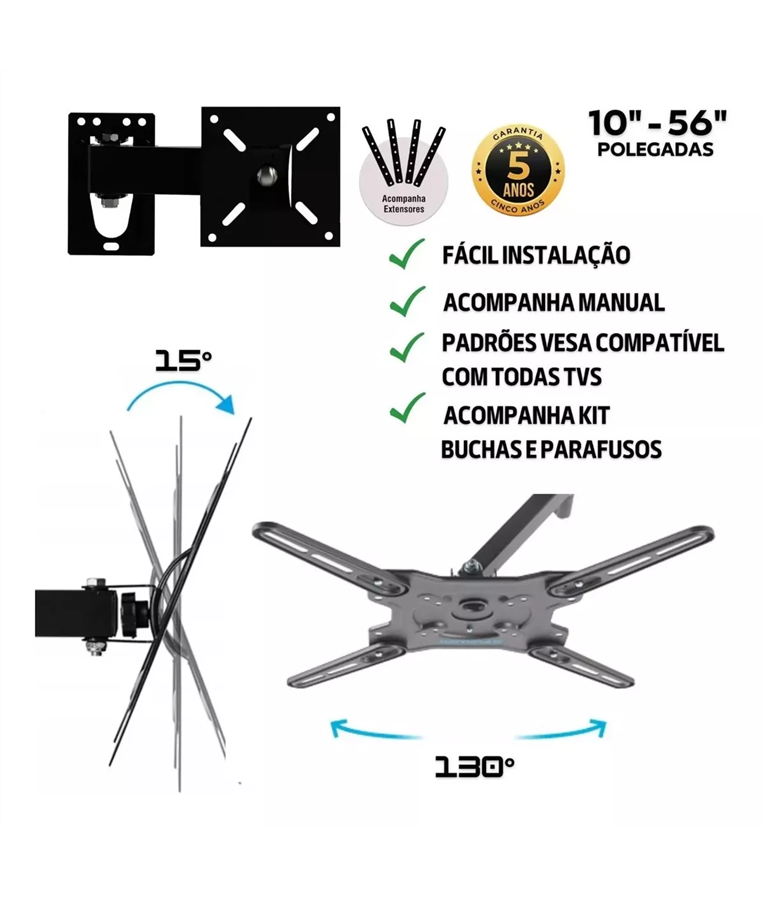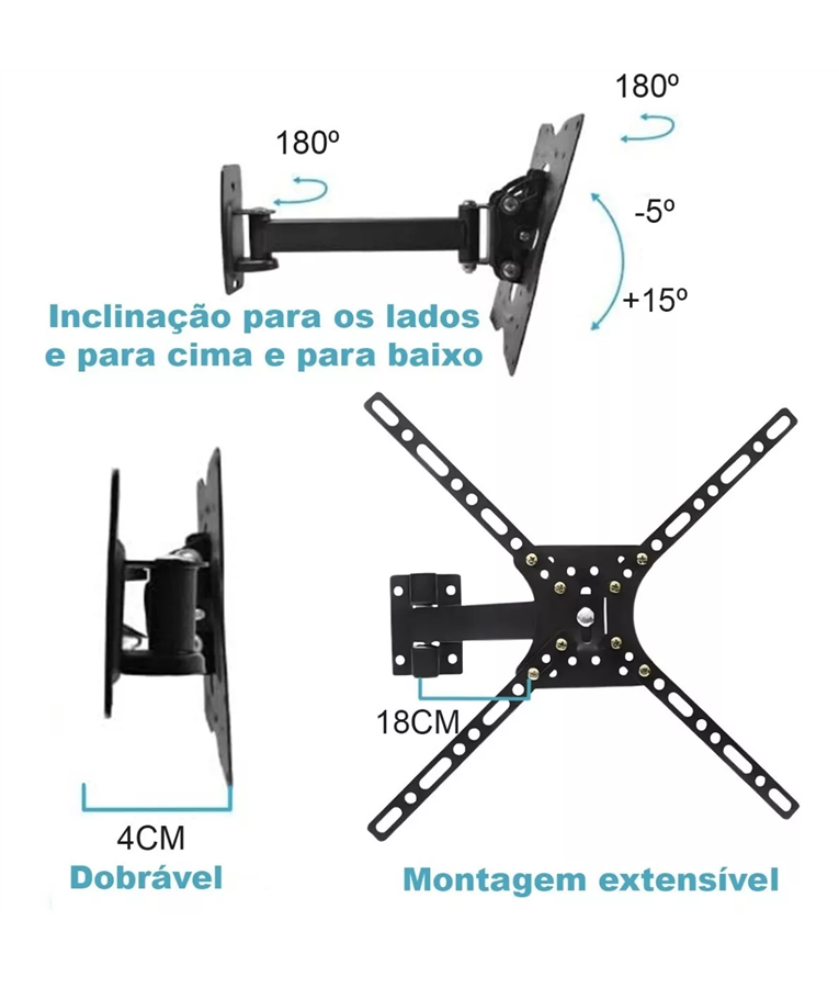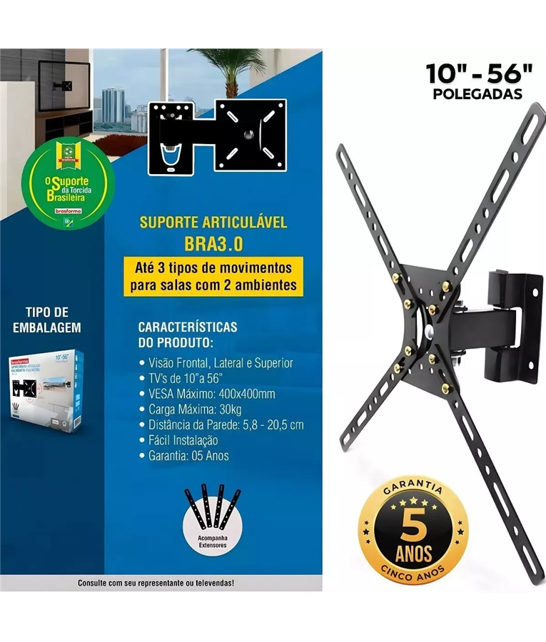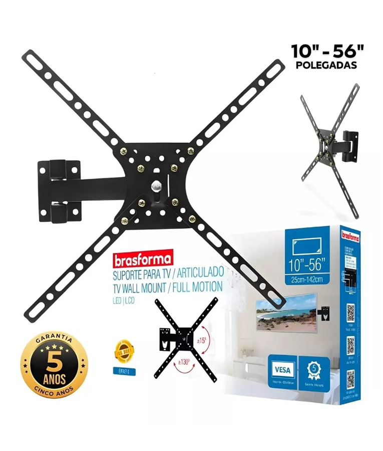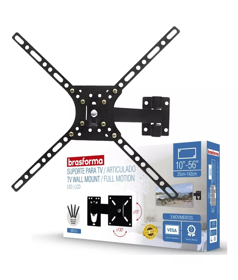 Suporte ARTICULADO para TV LED, LCD, Plasma, 3D e Smart TV de 10? a 60? - Brasforma BRA3.0 Suporte Articulado Brasforma para TVs LCD, LED, Plasma, 3D e Smart TV de 10 até 60 polegadas (com VESA máximo de 400x400mm). Permite inclinação, articulação e rotação (3 movimentos). Permite Ajustar a TV para assistir de vários ângulos. Ideal para salas, escritórios, quartos, hospitais, restaurantes, entre outros locais. SKU: BRA3.0 Descrição Diferenciais 5 anos de garantia Fácil instalação Conteúdo da Embalagem 1 Suporte para TV Hastes extensoras para VESA 400x400mm Kit de Parafusos 1 Manual de instruções Observações Verifique se a superfície de instalação apresenta resistência suficiente para uma instalação segura. Fique atento a carga máxima indicada para o suporte. Aconselhamos que a instalação seja realizada por um profissional da área. Verifique se a furação de sua TV é compatível com o suporte.
